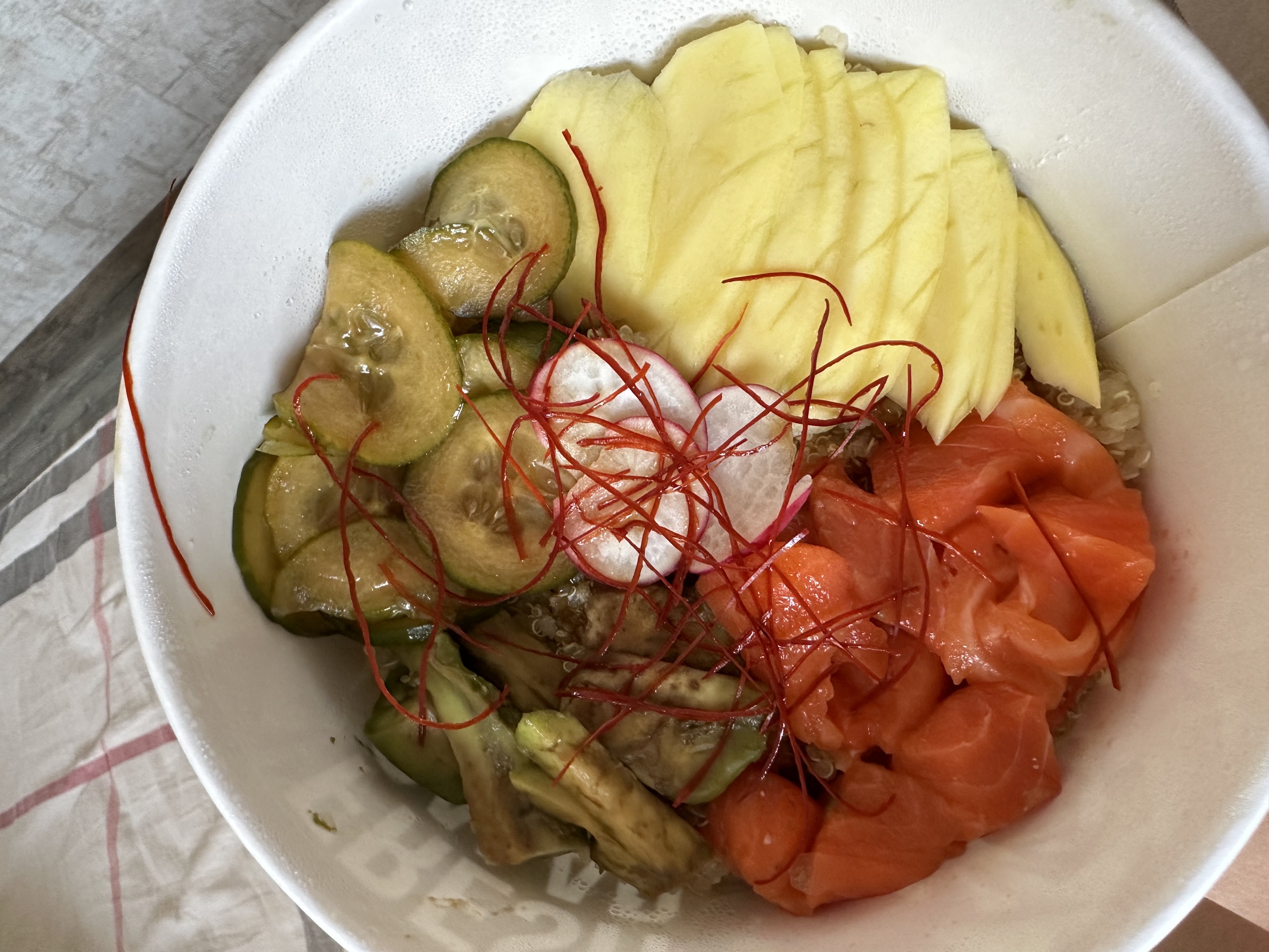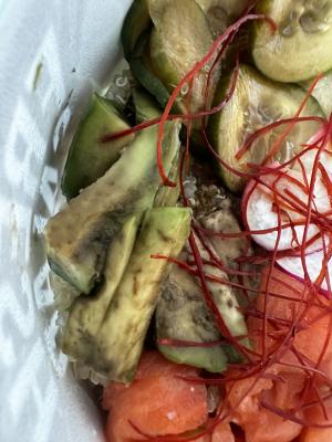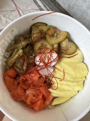 Состав: лосось, огурец, сливочный сыр, соус спайси, кунжут кимчи, соус терияки, кляр, сухари панко
