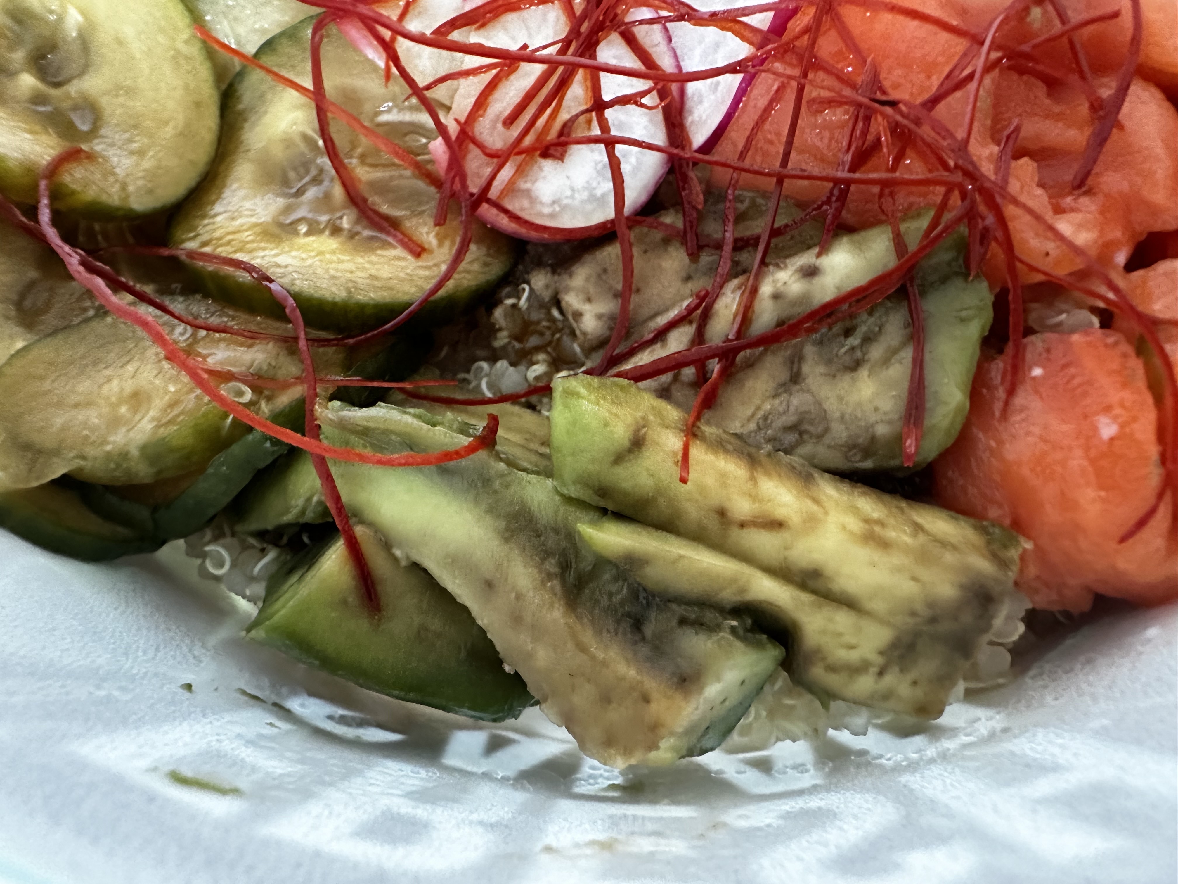 Состав: курица, цукини, лук красный, морковь, перец болгарский, масло чесночное, бобы эдомаме, рис, бульон вок, соус вок, соевые ростки, кунжут
