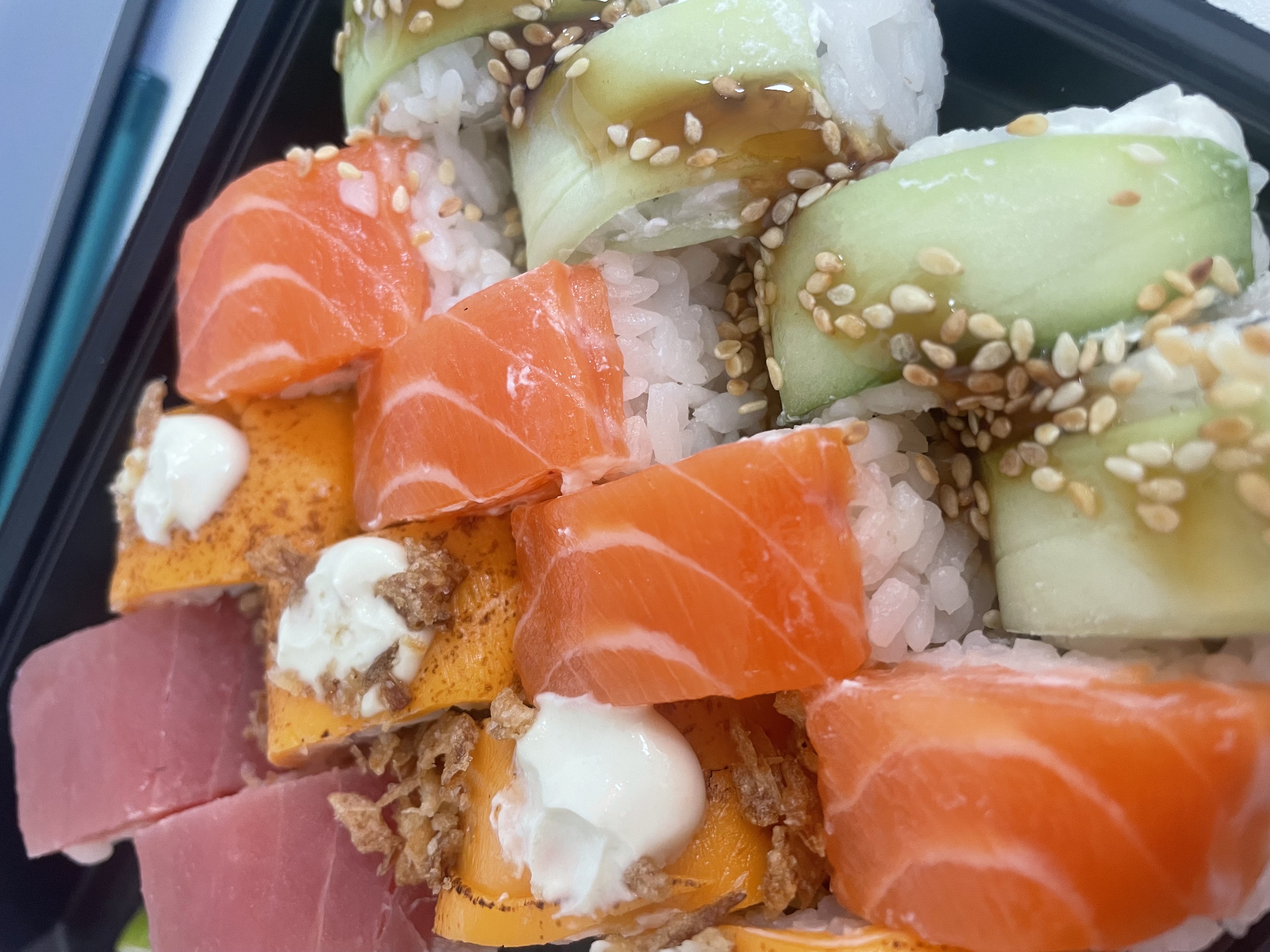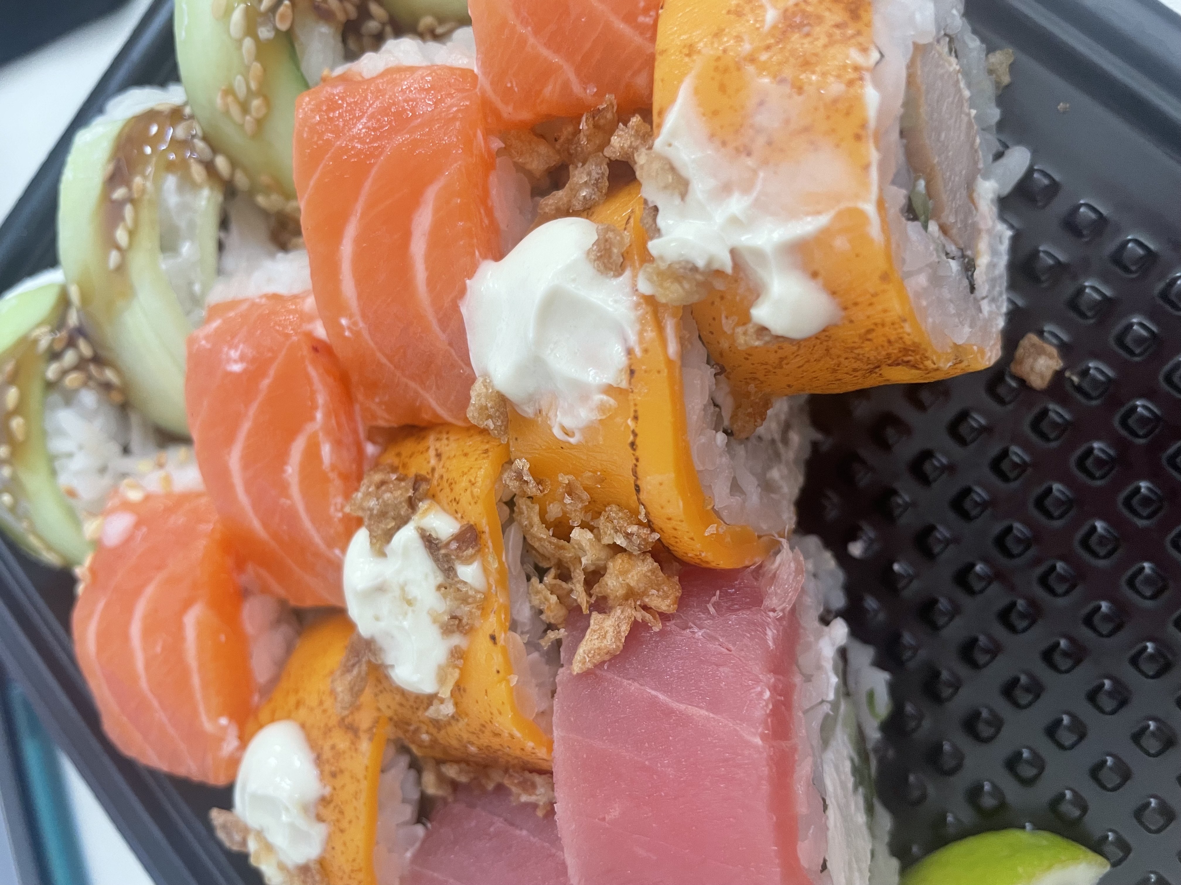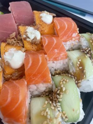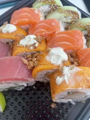 Состав: лосось, огурец, сливочный сыр, соус спайси, кунжут кимчи, соус терияки, кляр, сухари панко