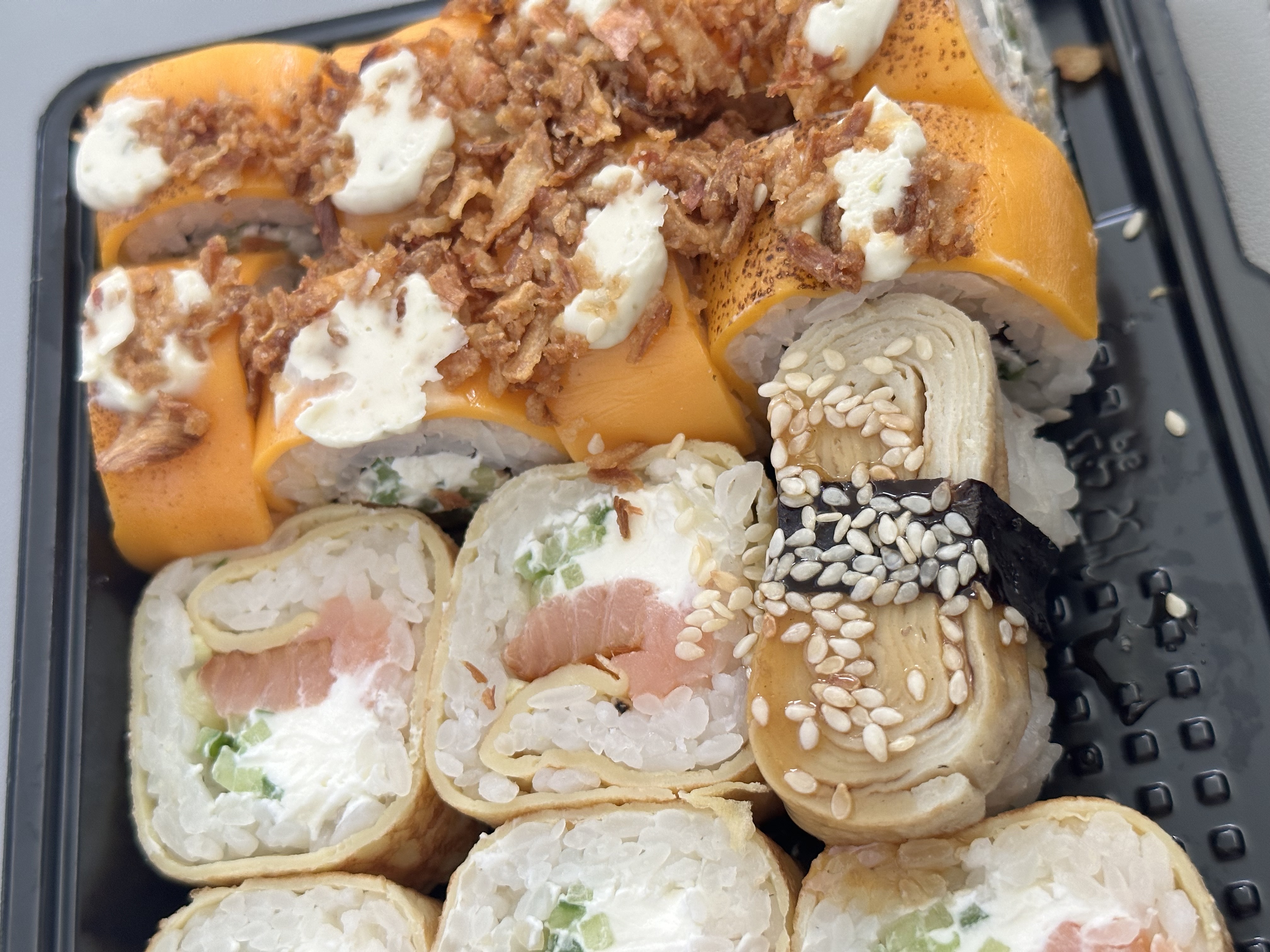 Состав: японский омлет, рис, нори, соус Унаги, кунжут белый