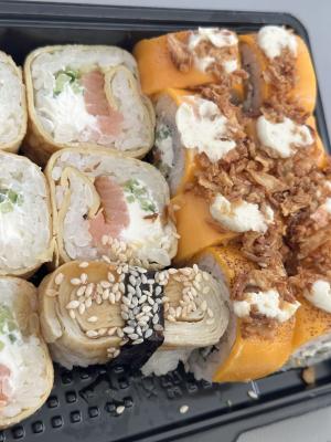 Состав: лосось, огурец, сливочный сыр, соус спайси, кунжут кимчи, соус терияки, кляр, сухари панко
