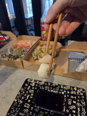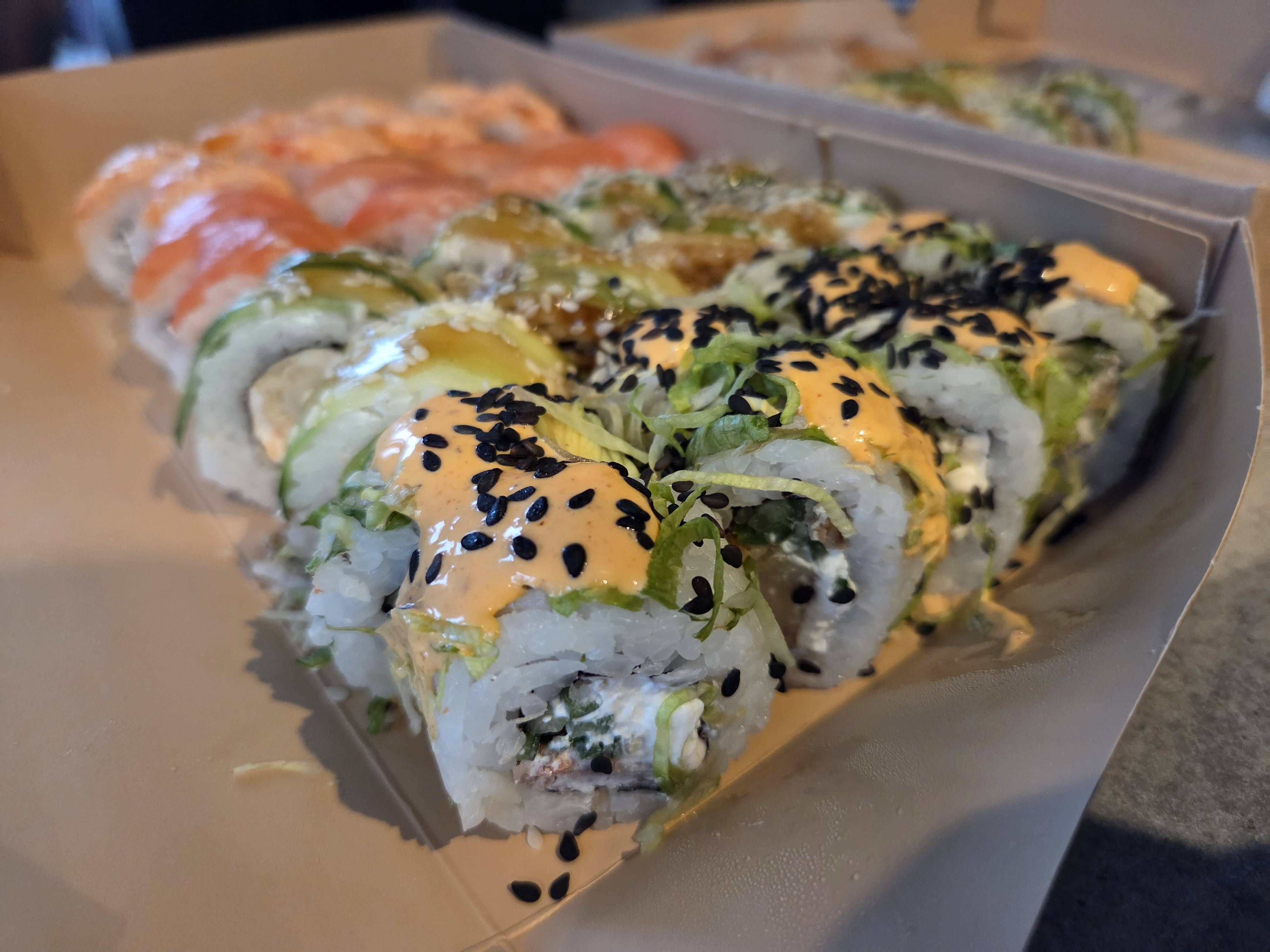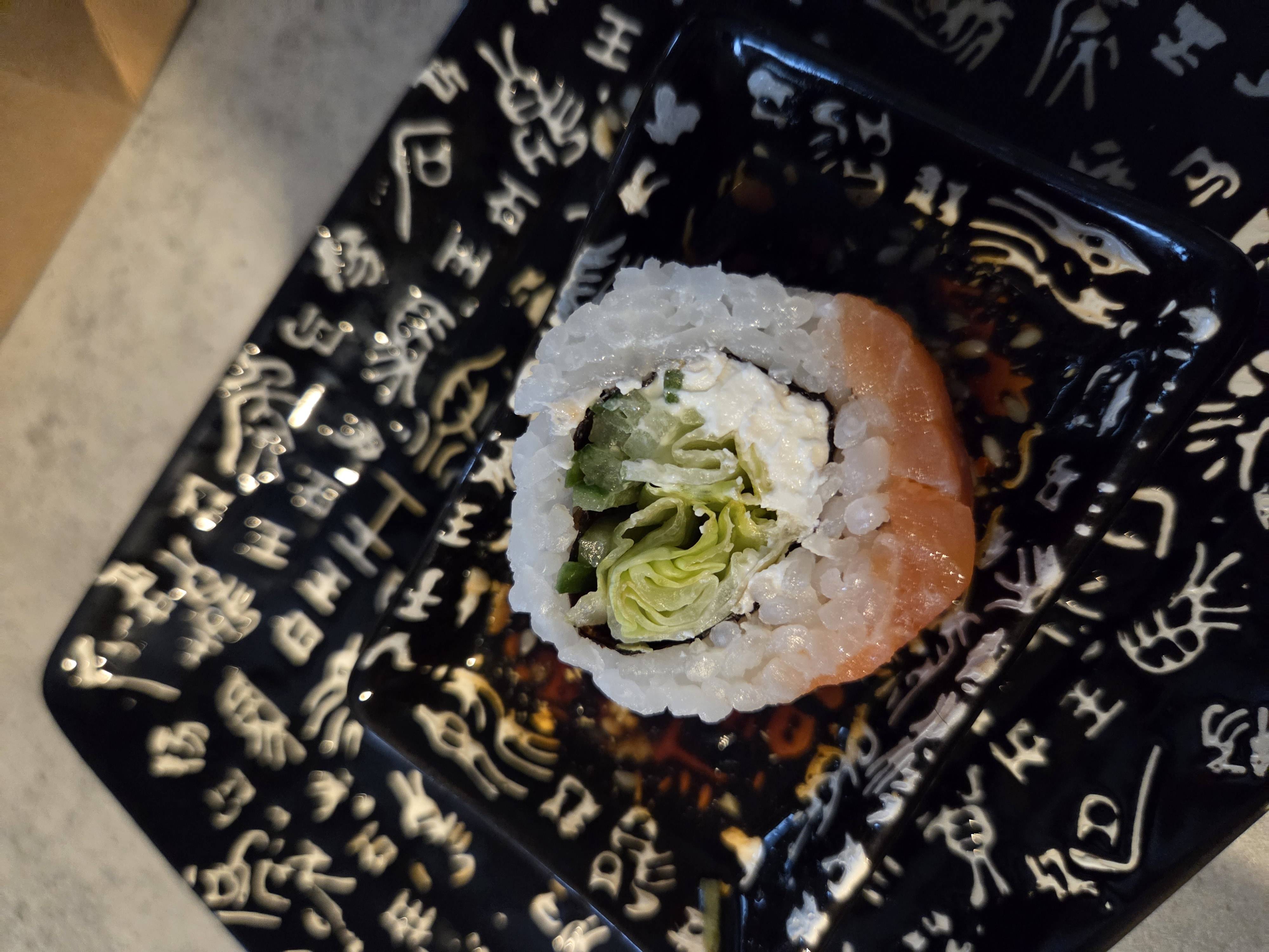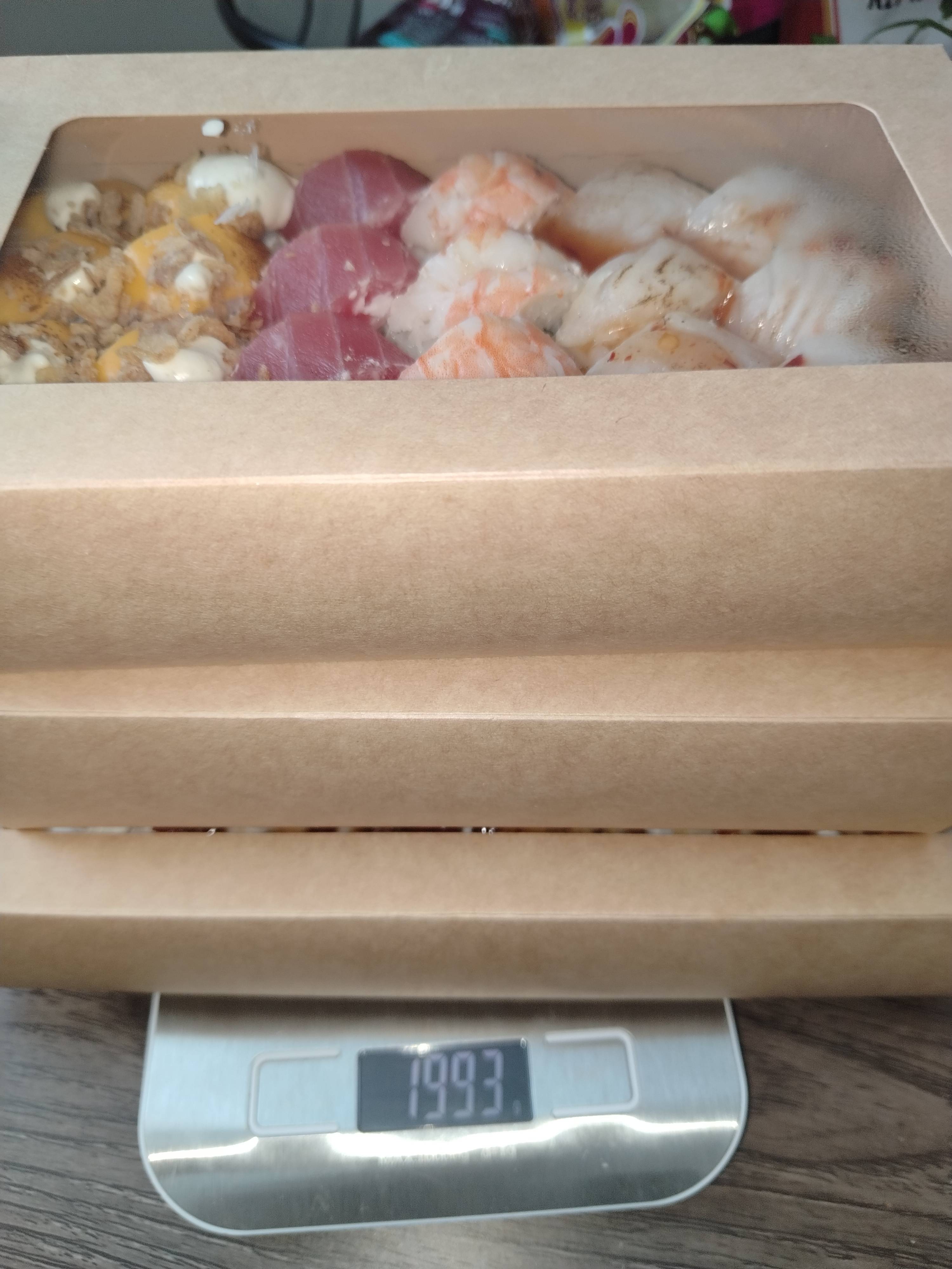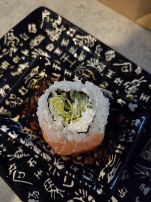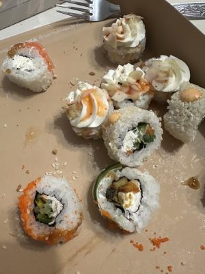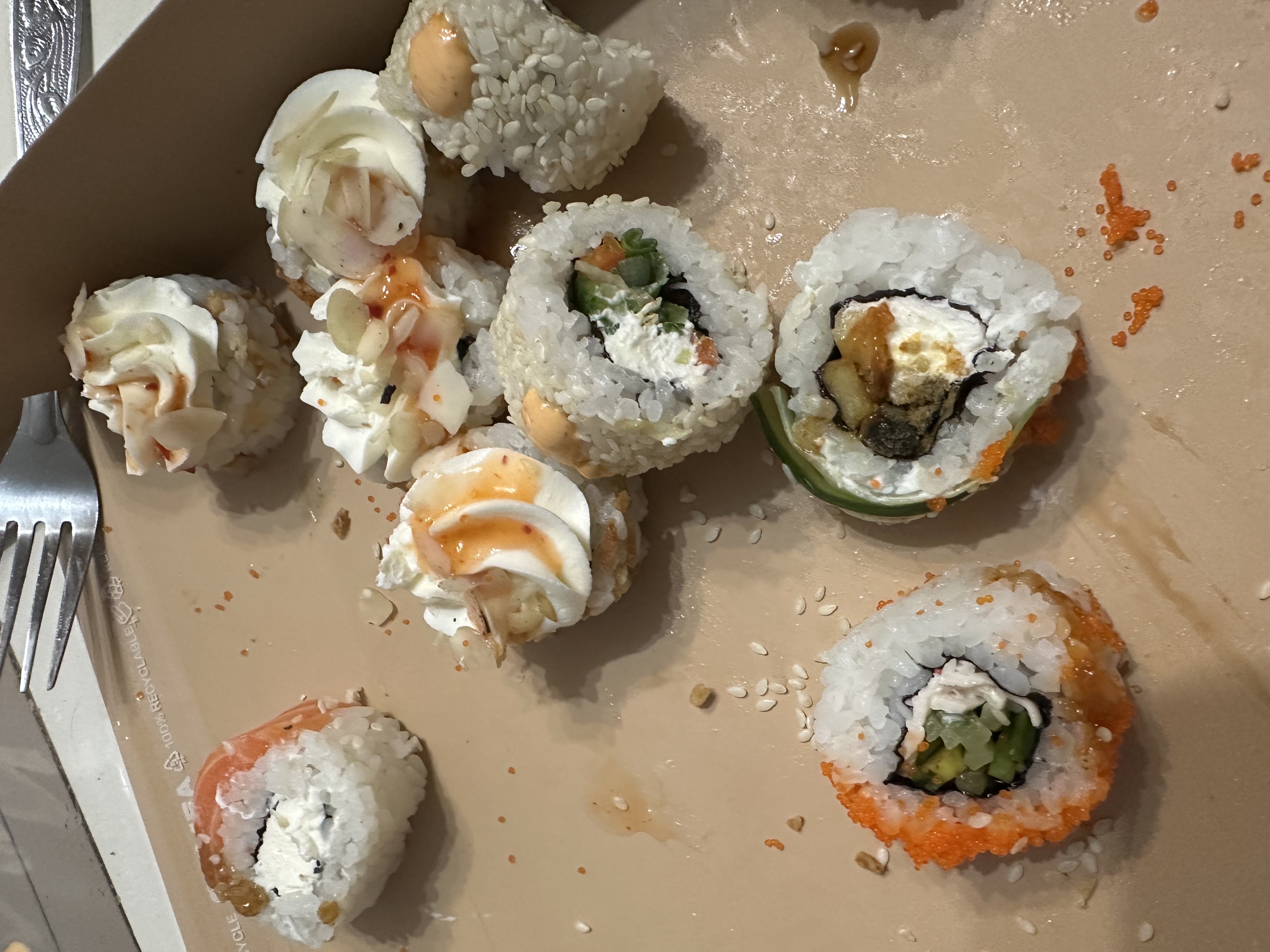 Сыра в суши хочется больше, и он почему-то сильно мягкий. По начинке - креветок и тунца достаточно, но лосося жалеете. Рис топовый, прямо как в плове, только суши на нём разваливаются. Хотя кладёте его не мало. В одном ролле ожидался васаби - не нашли.