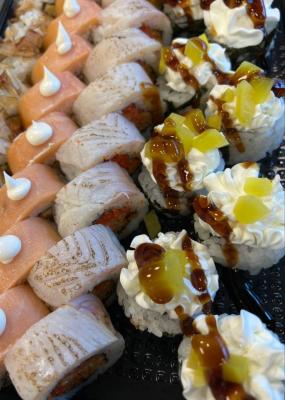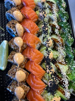 Состав: лосось, огурец, сливочный сыр, соус спайси, кунжут кимчи, соус терияки, кляр, сухари панко