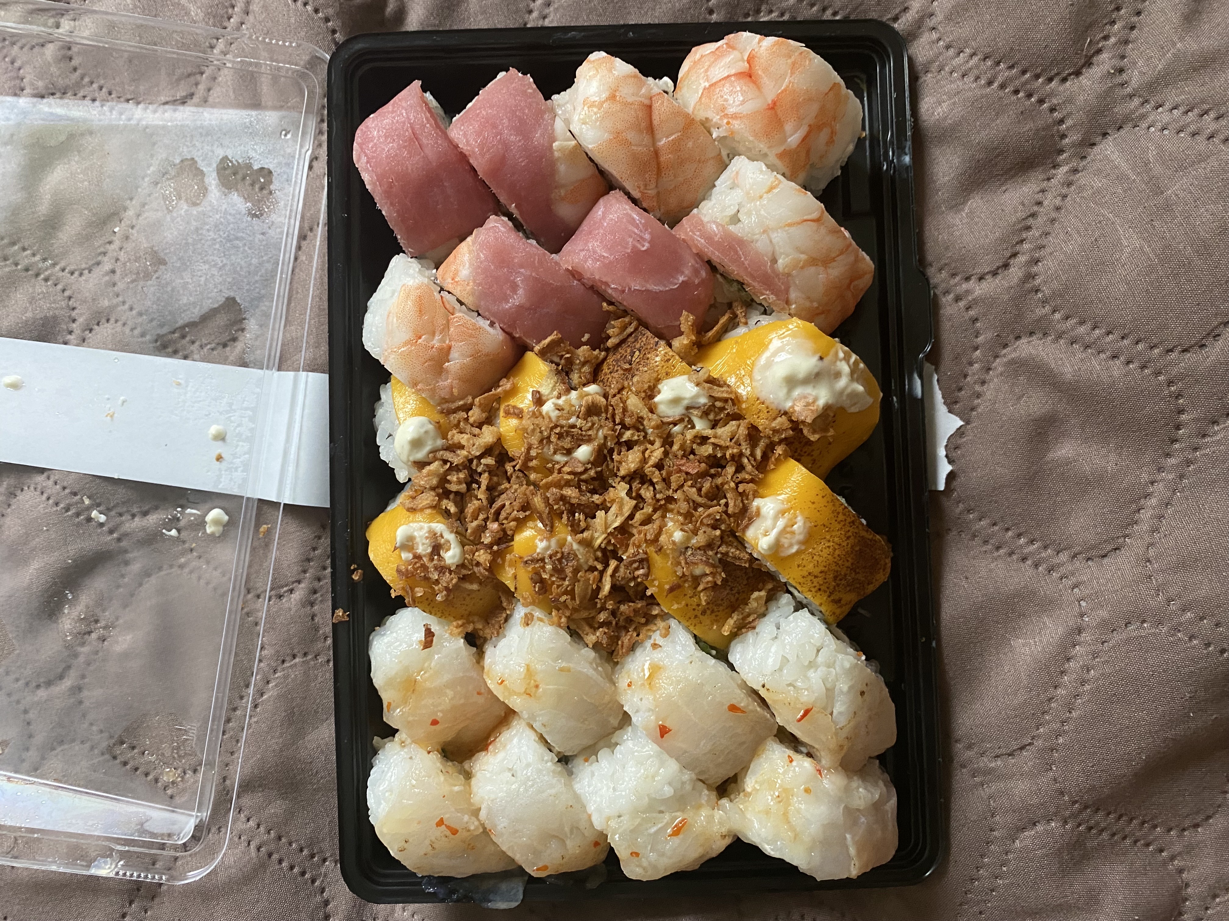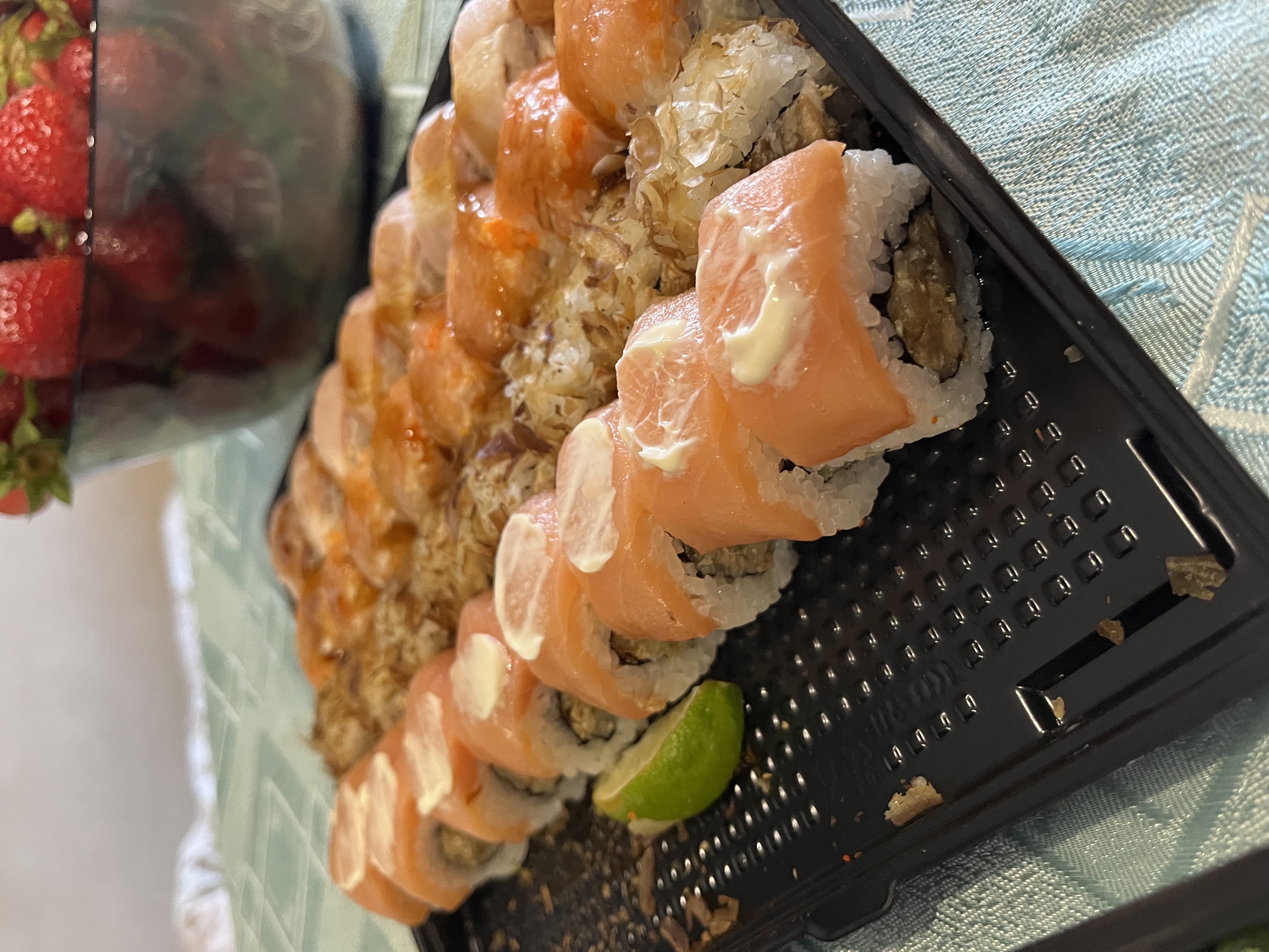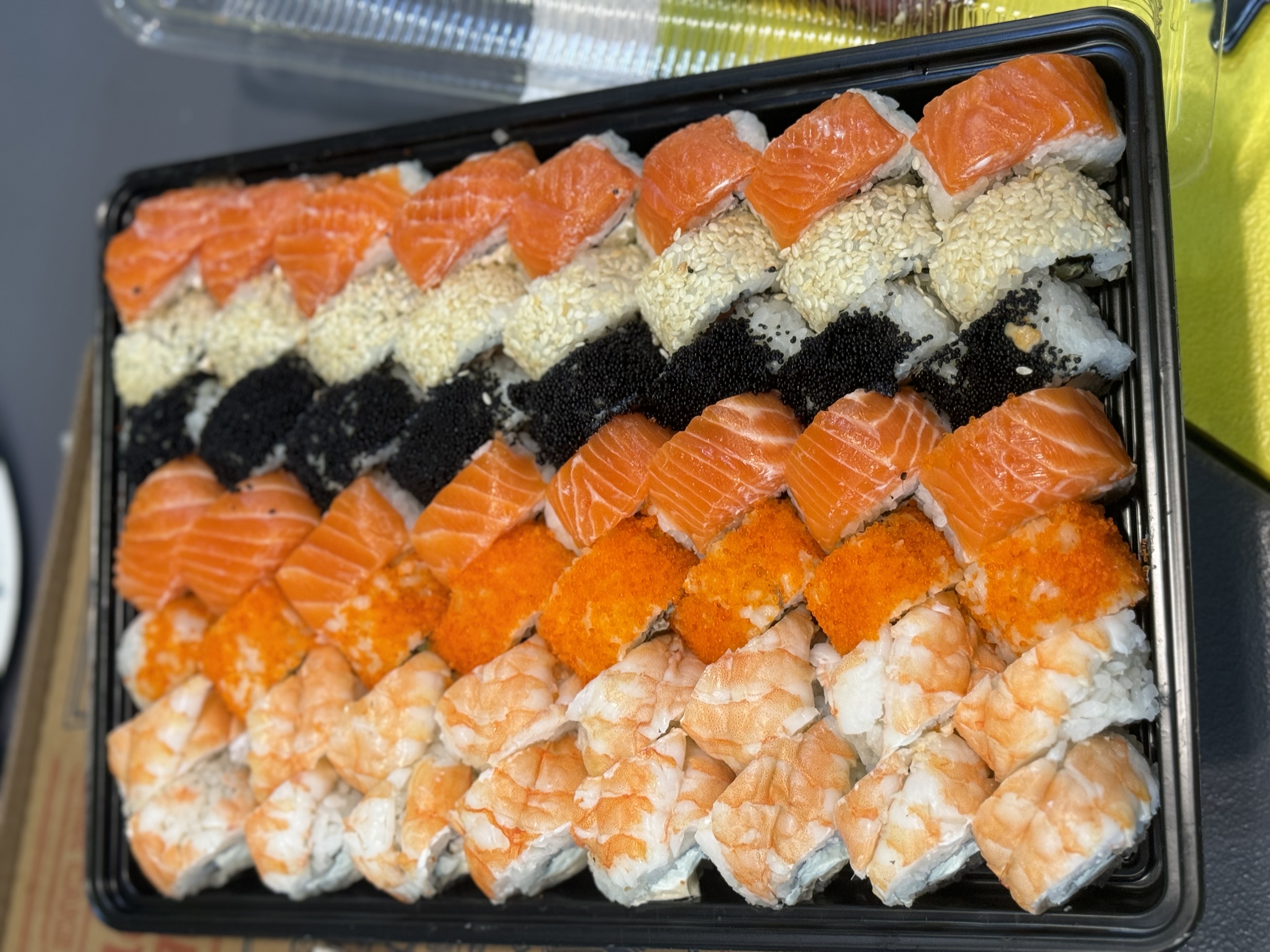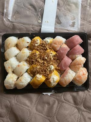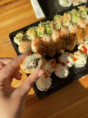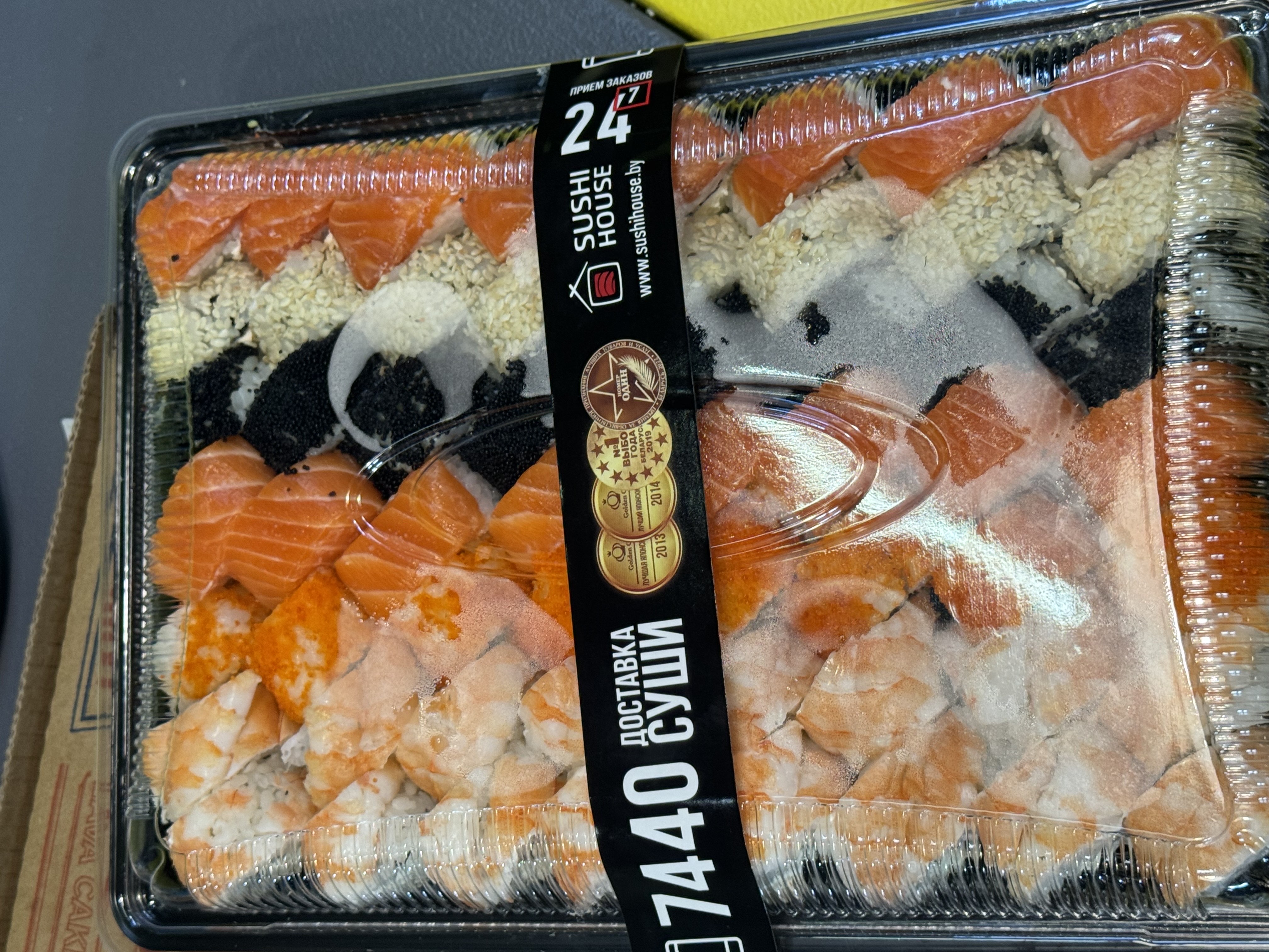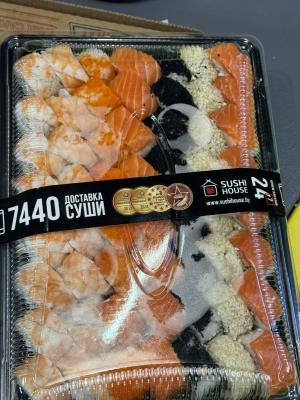 Две звезды только потому что это первый раз когда я обожглась. Брала суши раньше, но не часто - проблем не было. Сегодня заказала через сливки, описание уже насторожило - описаны 3 вида суши, а на картинке в боксе 4. Ладно, морально себя подготовила к тому что картинка отличается от реальности, но не на столько же! Рыба не то что просвечивается, ее площадь меньше пальца. Суши с креветкой так же. Местами креветка соединяется с рыбой. Такое ощущение что мне просто оставшиеся кусочки рыбы положили сверху. Блинчика это тоже касается местами блинчик полностью охватывает рис, а местами как и рыба))