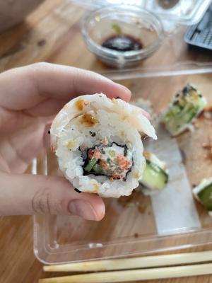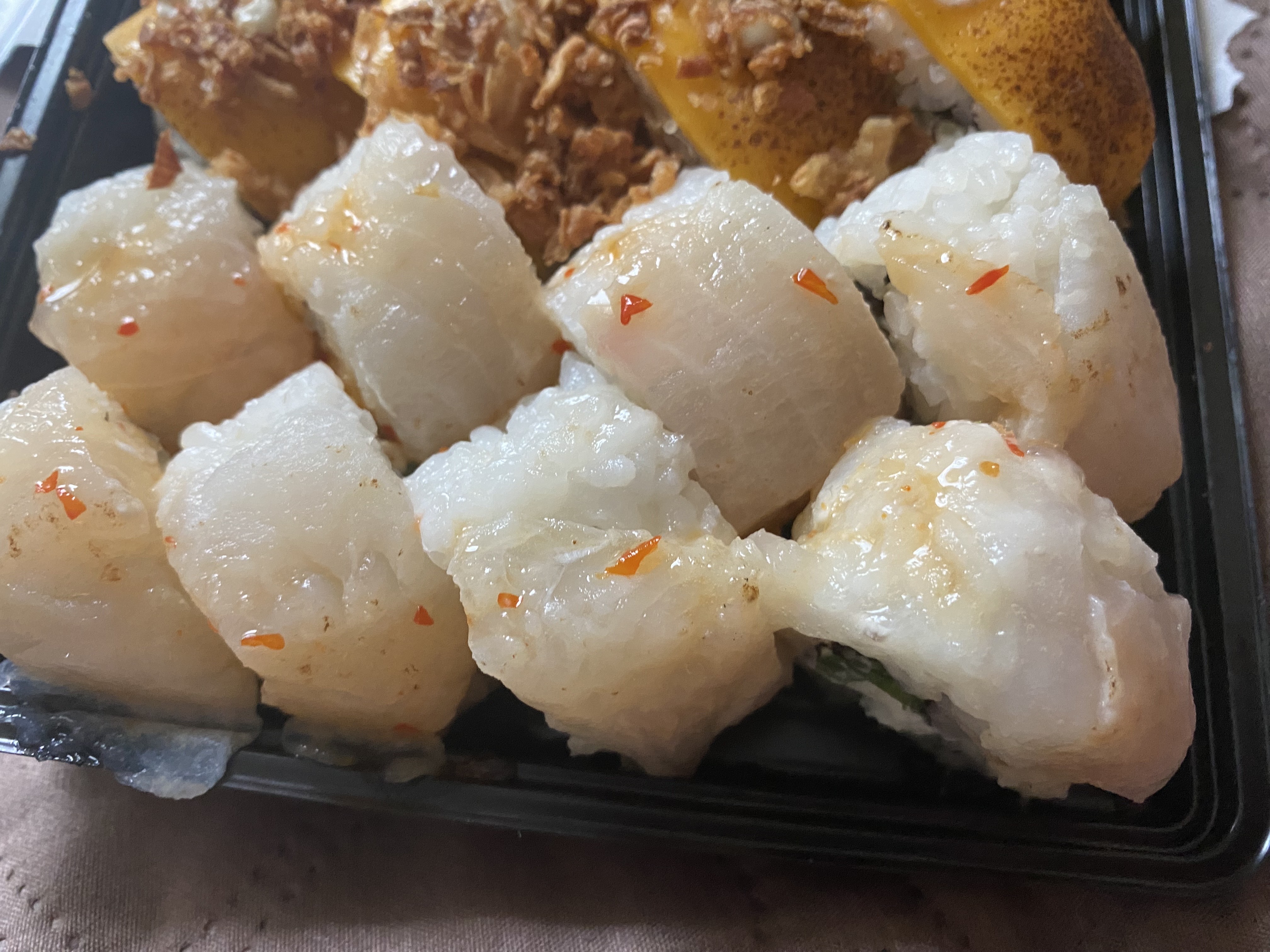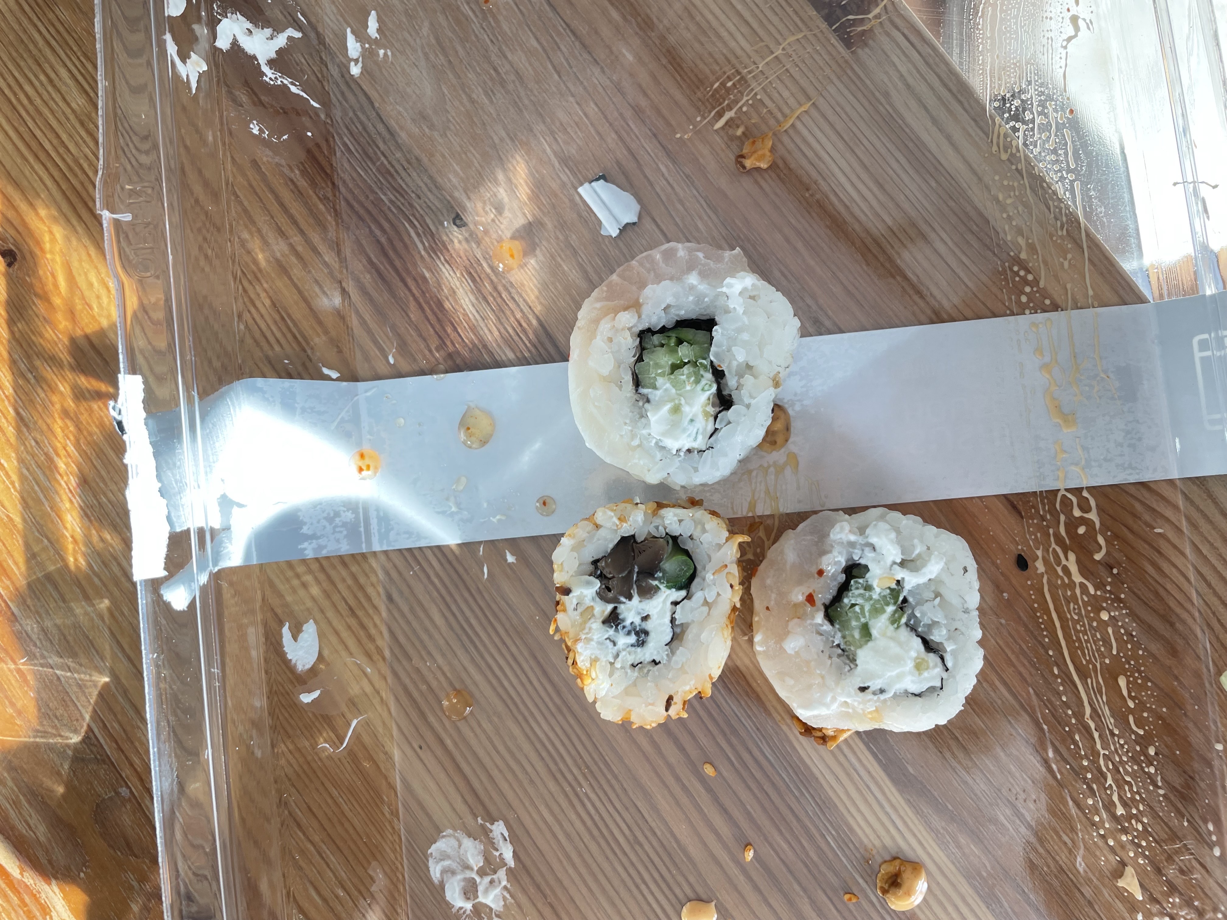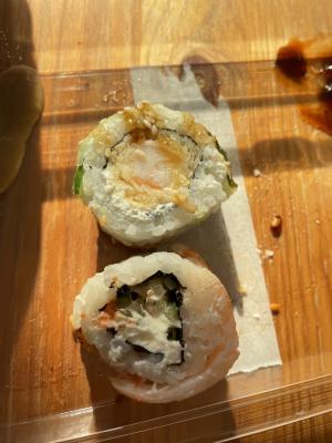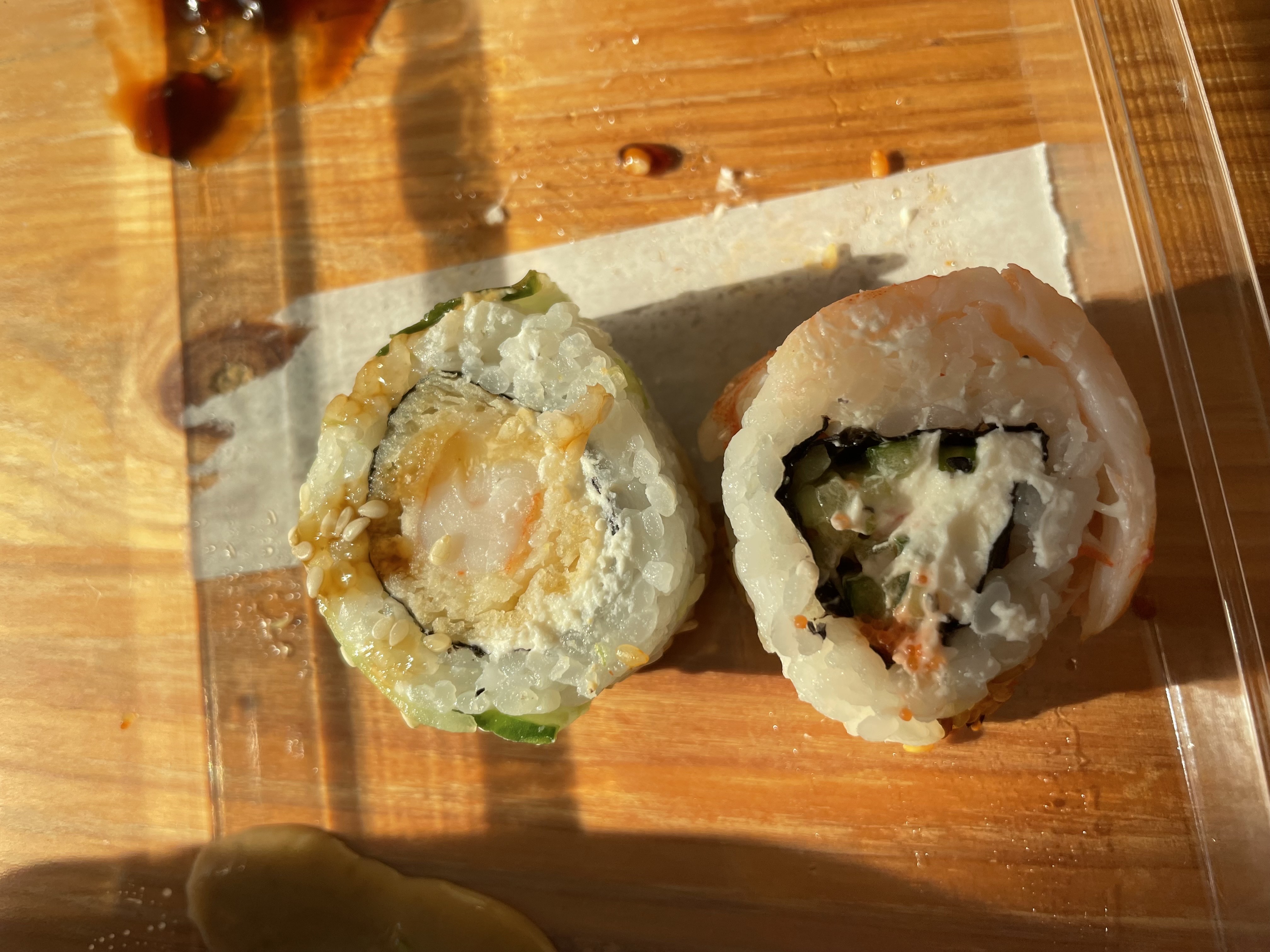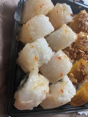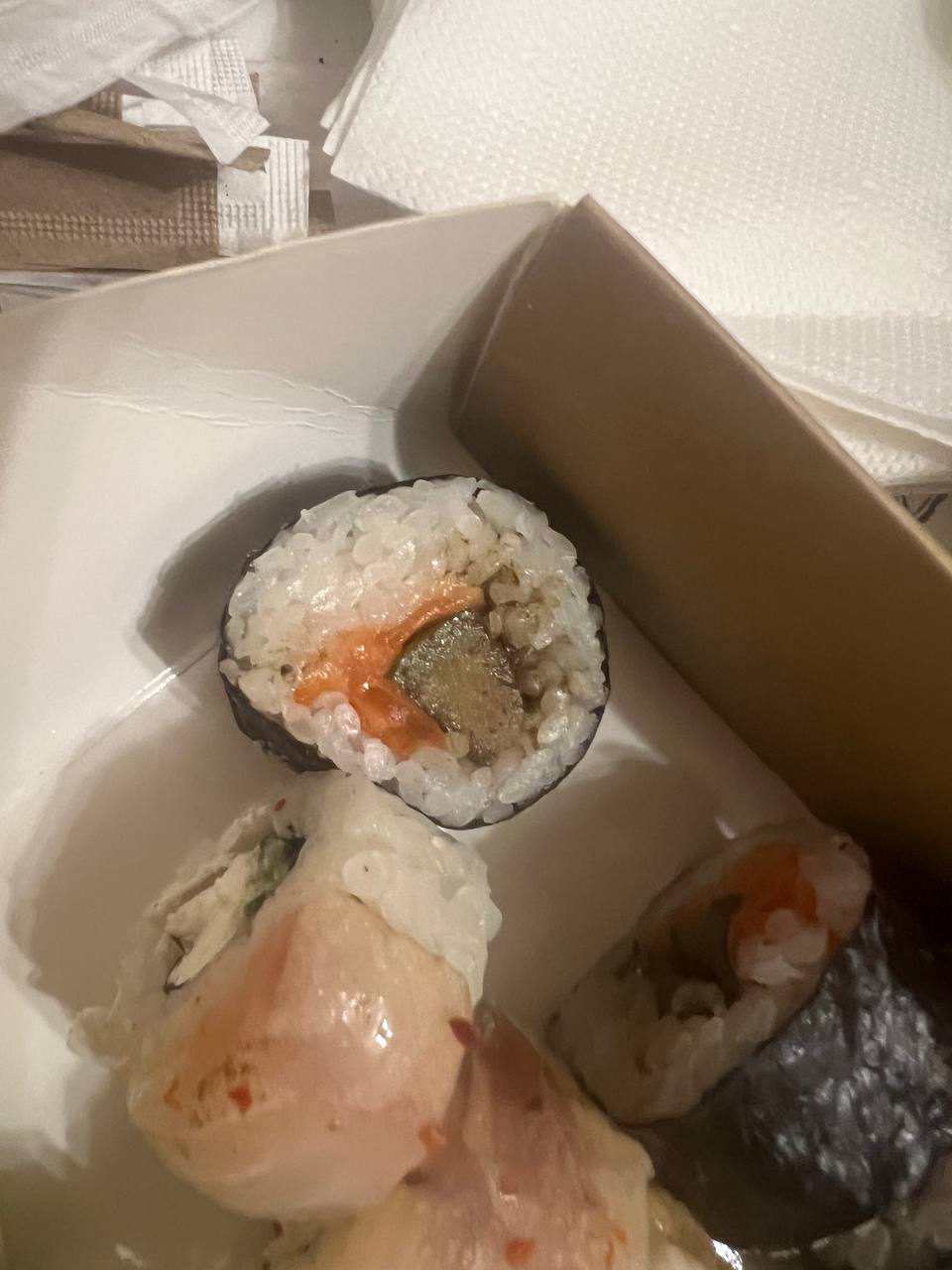 Две звезды только потому что это первый раз когда я обожглась. Брала суши раньше, но не часто - проблем не было. Сегодня заказала через сливки, описание уже насторожило - описаны 3 вида суши, а на картинке в боксе 4. Ладно, морально себя подготовила к тому что картинка отличается от реальности, но не на столько же! Рыба не то что просвечивается, ее площадь меньше пальца. Суши с креветкой так же. Местами креветка соединяется с рыбой. Такое ощущение что мне просто оставшиеся кусочки рыбы положили сверху. Блинчика это тоже касается местами блинчик полностью охватывает рис, а местами как и рыба))