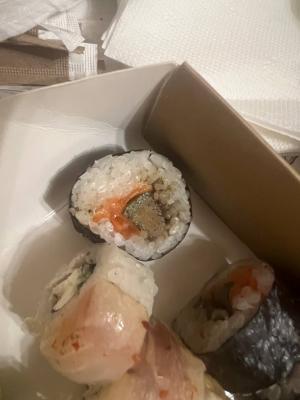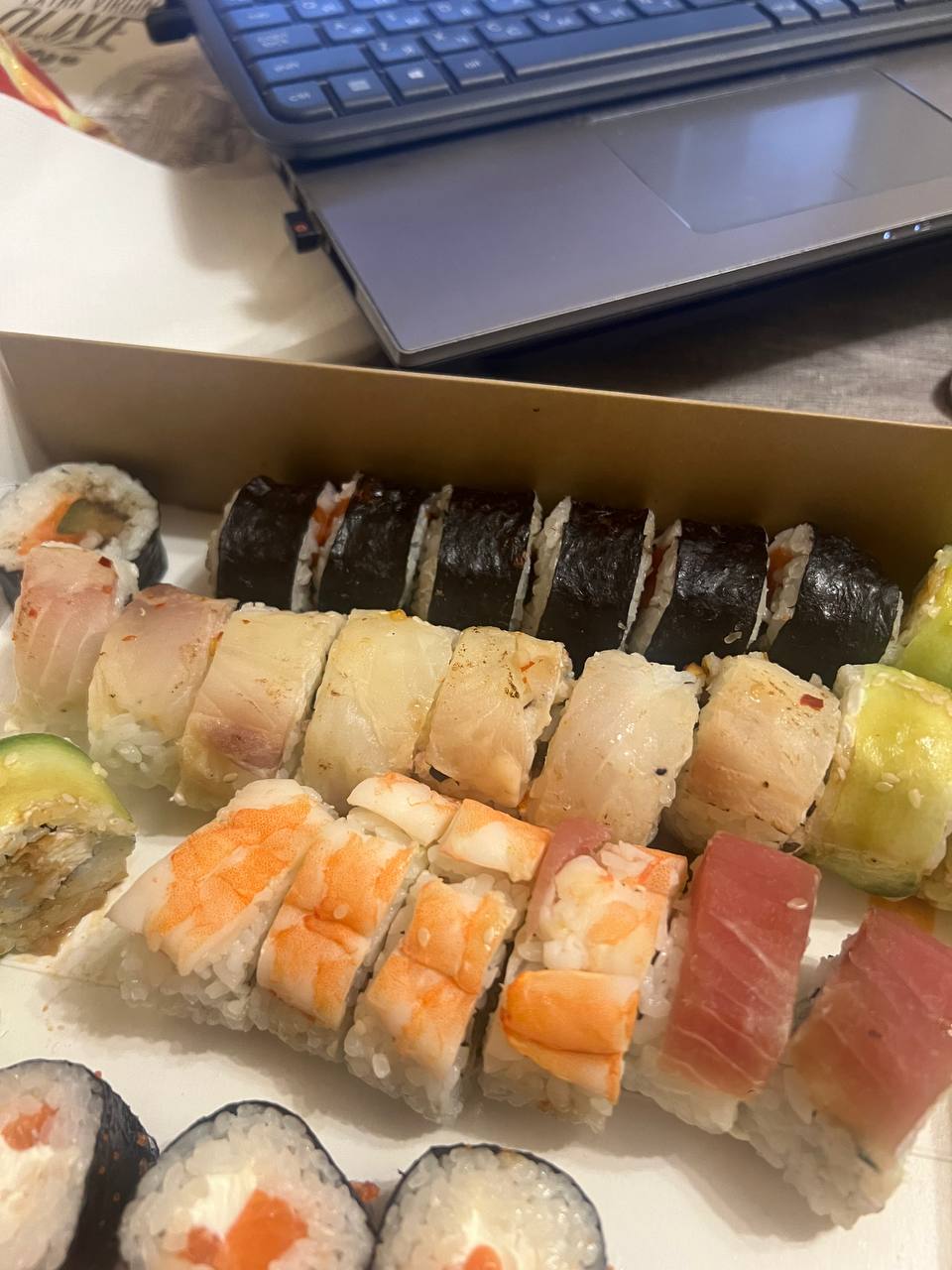 Суши не свежие, тоже самое если бы полежавшие купили в магазине, и то в магазине бывает вкуснее. Курьер опоздал на 30 мин. Причем позвонил сказал что будет через 15 когда уже время истекло, приехал через 30 и даже не извинился. А на вопрос опоздания еще и нахамил как будто я ему должна еще заплатить за то, что он вообще приехал. Вообщем и суши плохого качества и сервис под стать. На фото кст видно когда крайний срок доставки, мне привезли суши только в 22:07, когда уже нечего не хотелось кроме как спать.