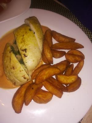 Состав: филе цыпленка, перец сладкий, шампиньоны, сливочный соус, салат из огурцов и томатов черри |