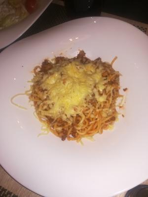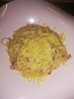 Состав: спагетти, ветчина, грибы шампиньоны, соус "Бе-шамель" со сливками, сыр |
