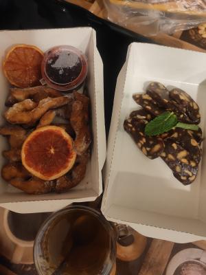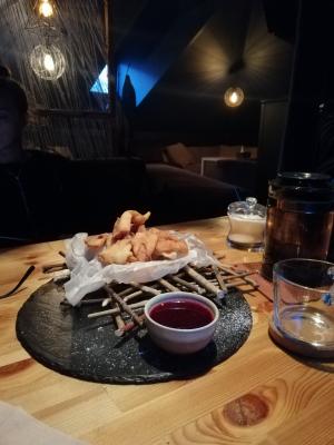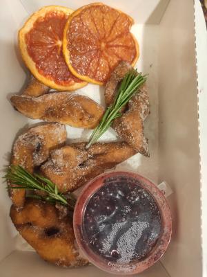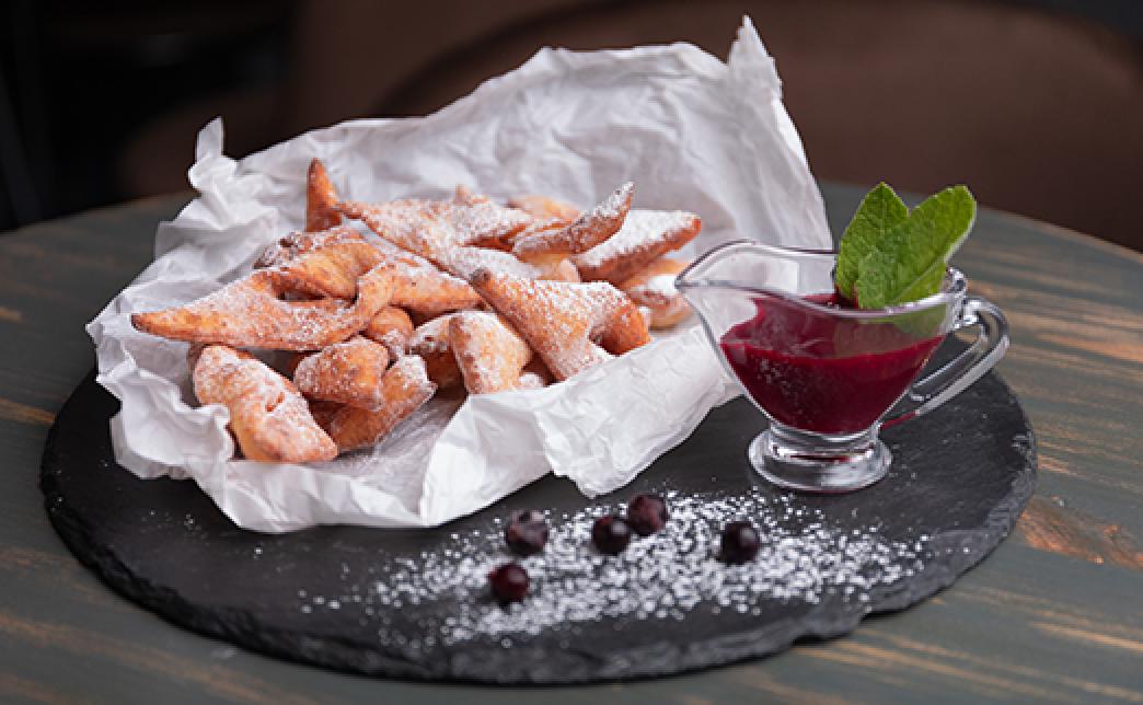 Состав: воздушный хворост из творожного теста с соусом из черной смородины