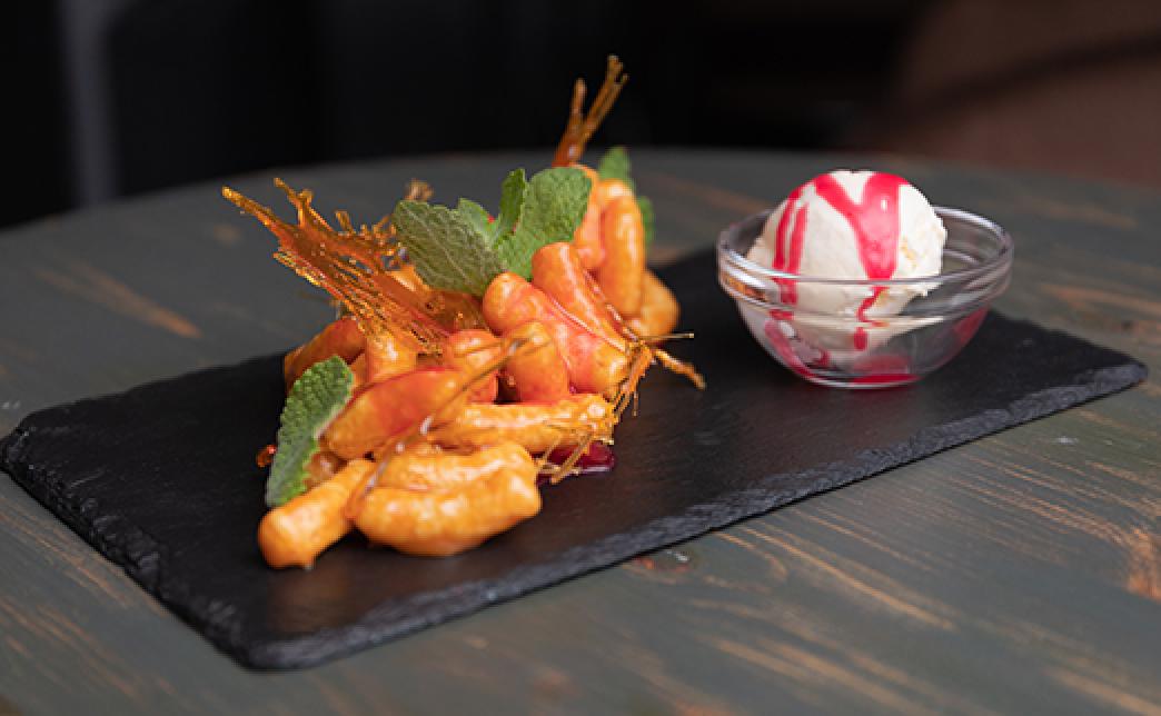 Состав: воздушные кукурузные палочки в соленой карамели и клюквенном соусе с шариком домашнего мороженного
