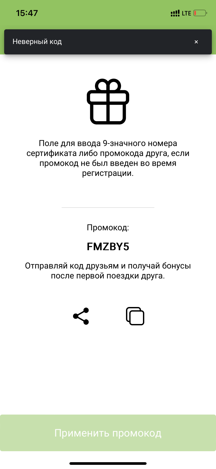 - При успешном введении промокода в момент регистрации в приложении "Hello каршеринг" будет начислено 12 бонусных баллов, эквивалентных 12 р.