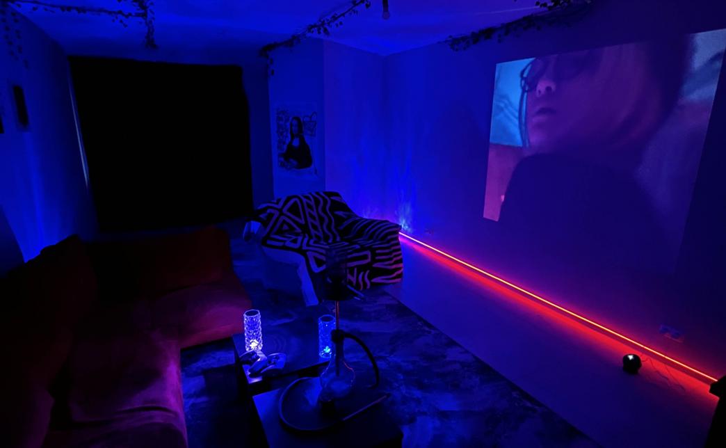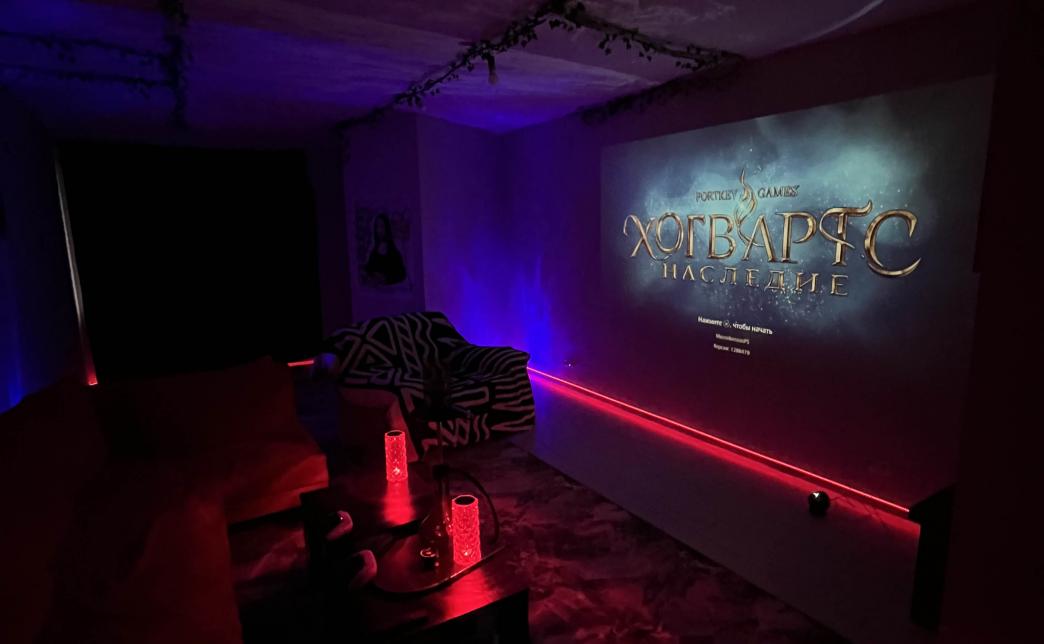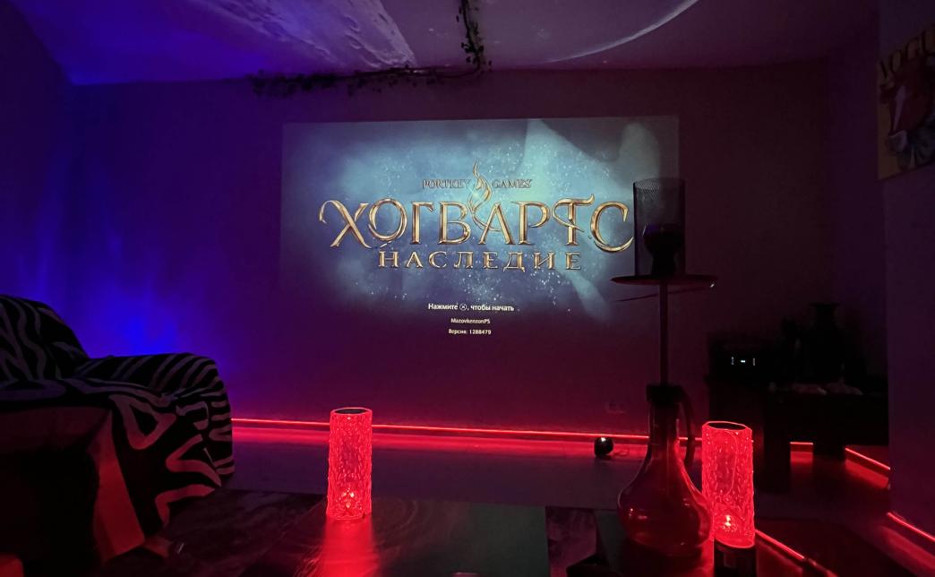 В приватном киноруме вас ждет уютная атмосфера: мягкие диваны и пуфики, стильные столы и приятное неоновое освещение, создающие комфортную обстановку для просмотра фильмов и игр.