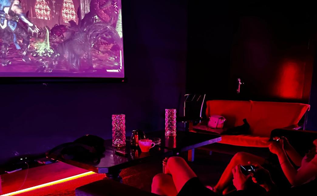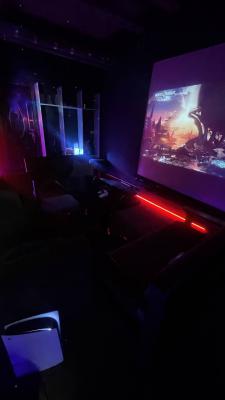 • Уютный уголок, где царит атмосфера домашнего кинотеатра. Мягкие диваны и приглушенный неоновый свет создают ощущение уюта и спокойствия.
