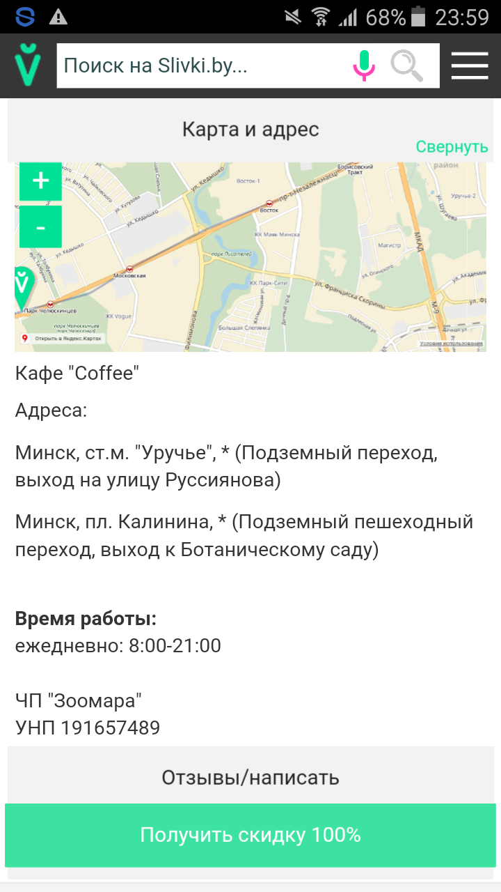 На счет кофейни на Уручье. Указано что кофейни работают ежедневно. В итоге в воскресенье мы поцеловали дверь. Вернее девушка которая в том же павильене продает цветы (да да там кофе продавалось вместе с цветами!)сказала что сегодня не работает кофейня. Кто все таки изъявит желание туда попасть, то она находится прямо в переходе метро, правда не помню в хвост или начало вагона, выход на сторону ул.руссиянова, ориентир - там продают цветы