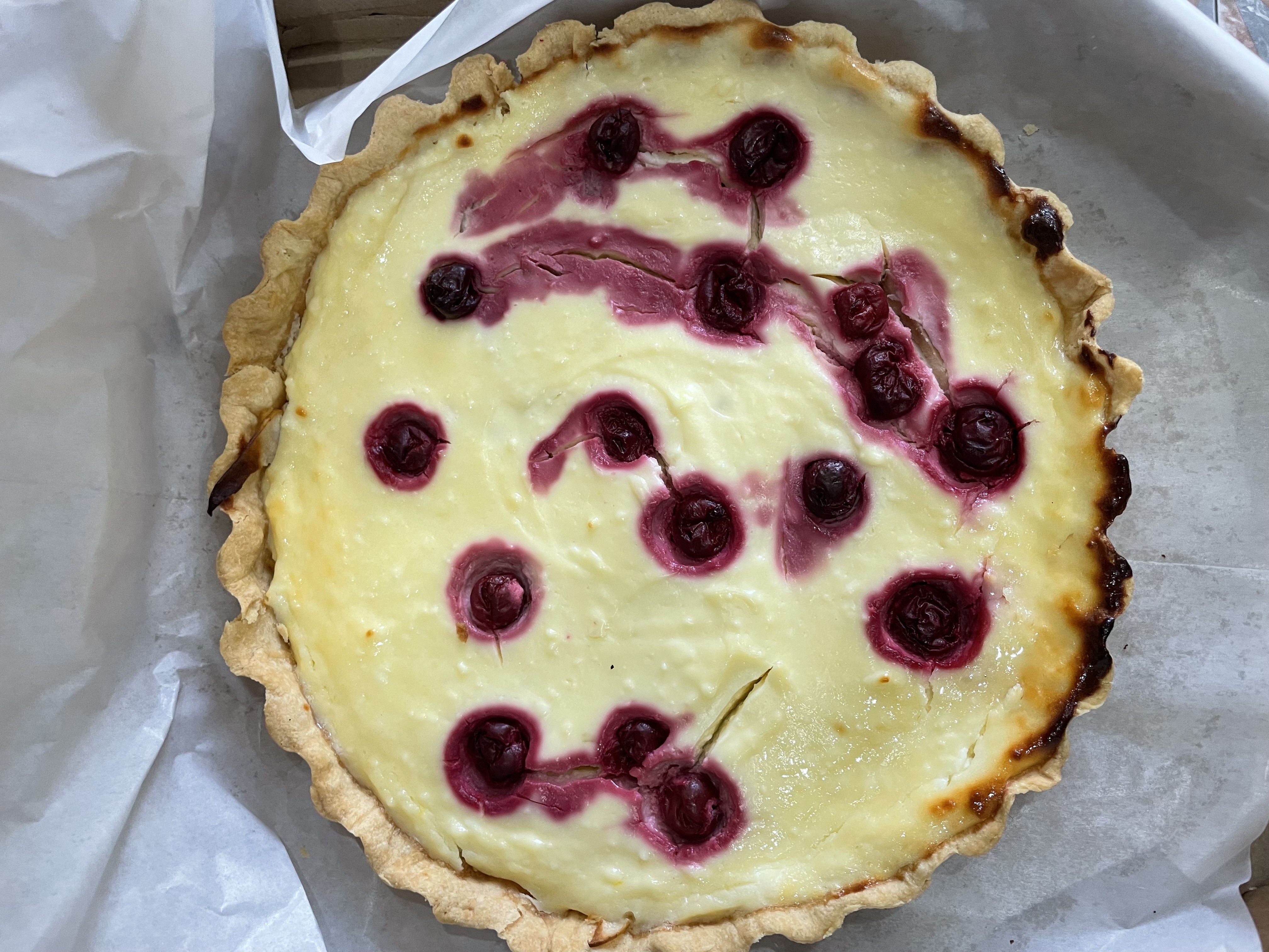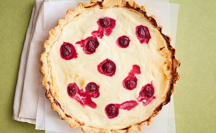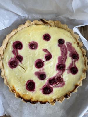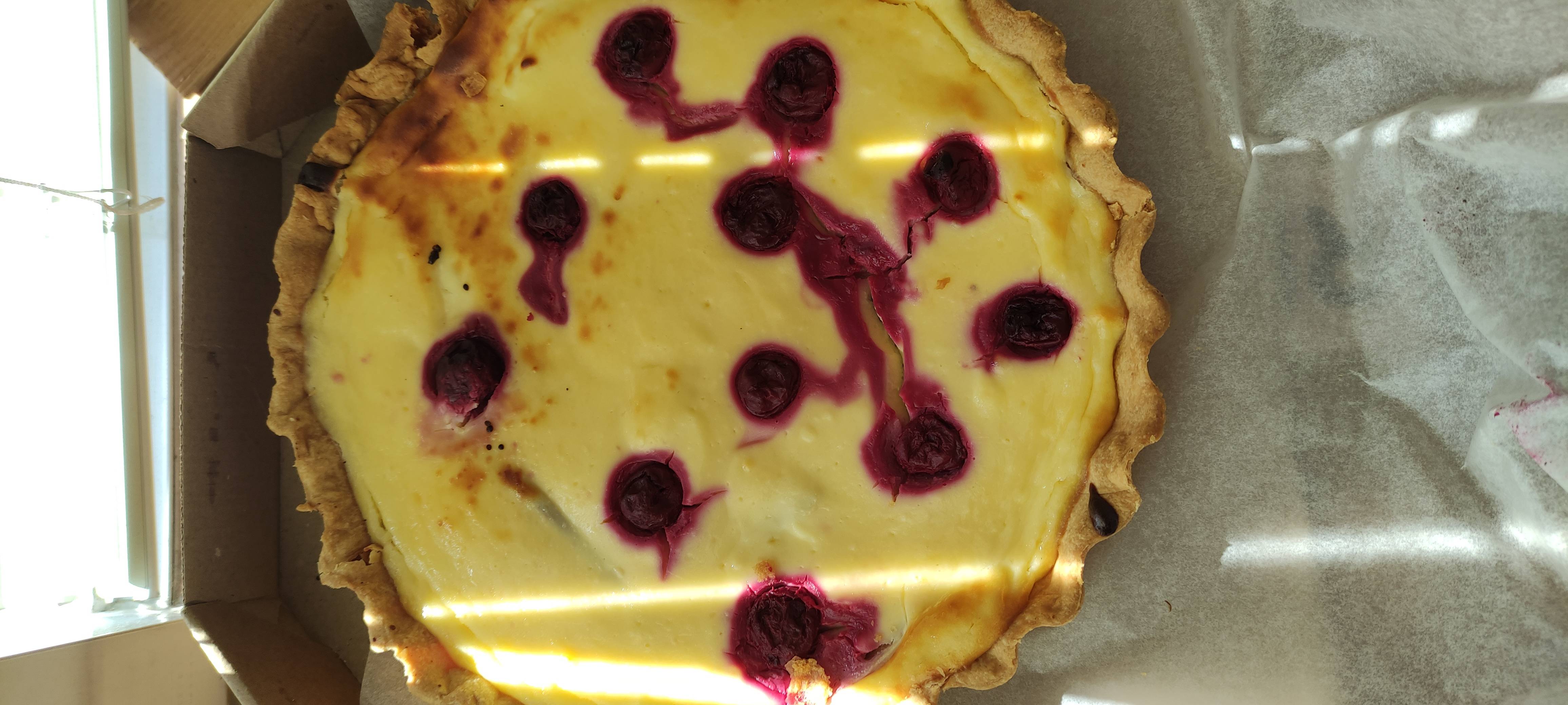 Киш с грушей, вишней и сливочным сыром (900 г) Состав: основа из песочного теста, яйцо, сыр сливочный, сахар, крахмал, лимон, сливки, груша, вишня