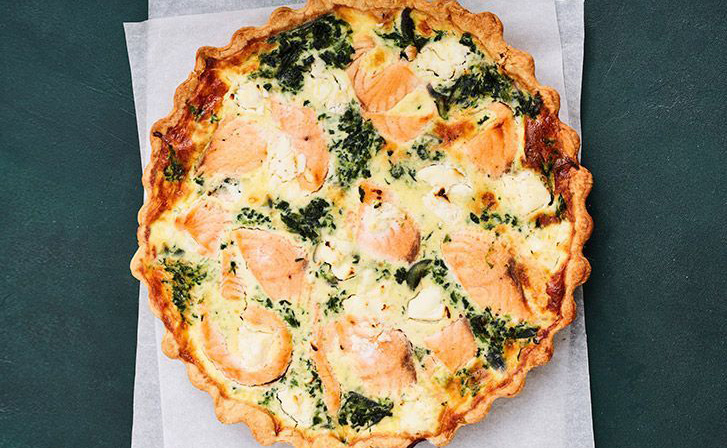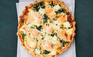 Киш с красной рыбой и шпинатом (920 г) 51,75 р. 69 р. Состав: основа из песочного теста, яйцо, сливки, сыр твердый, сыр фета, филе лосося, лук репчатый, чеснок