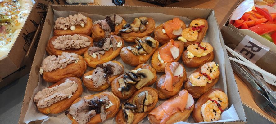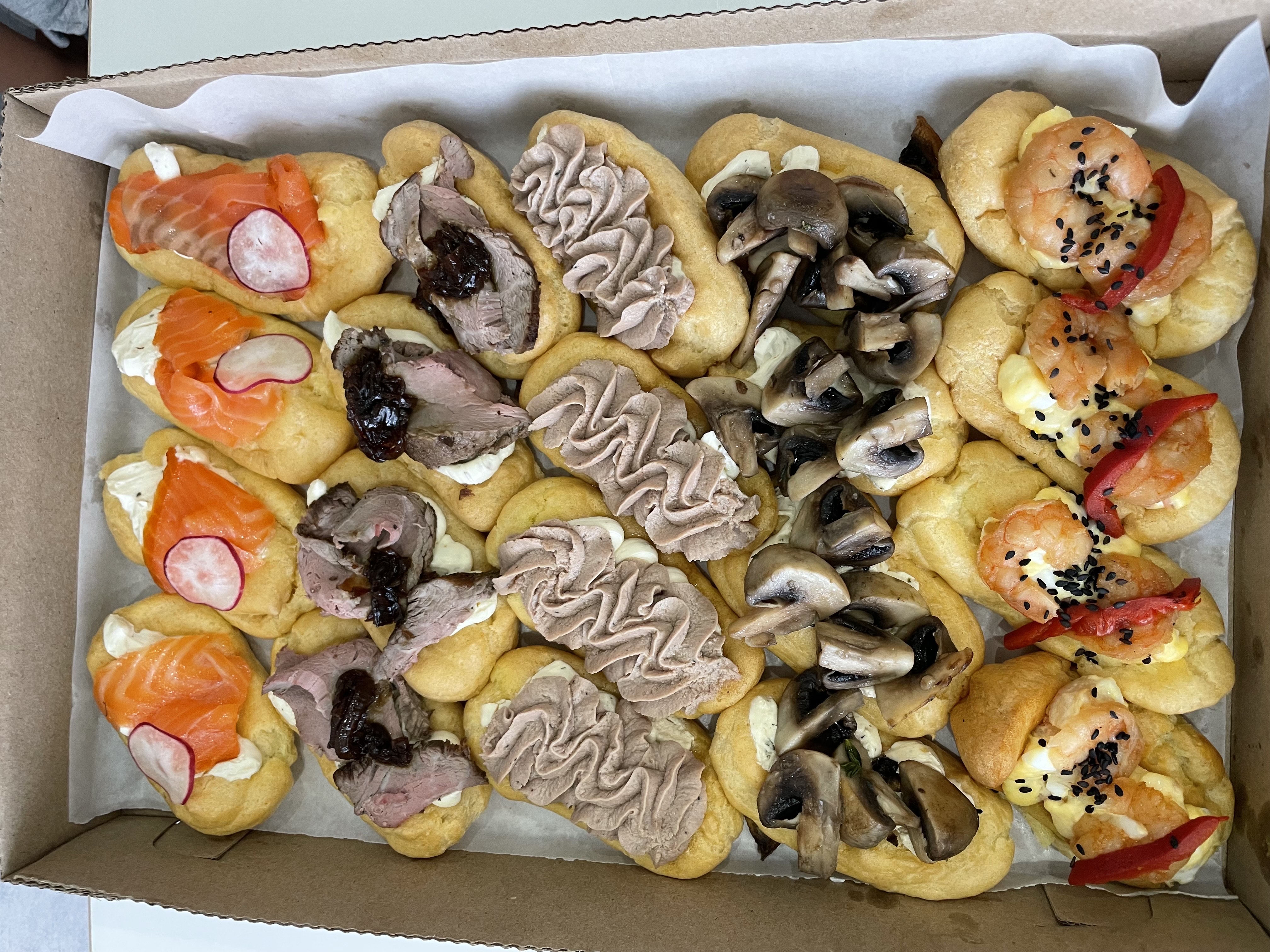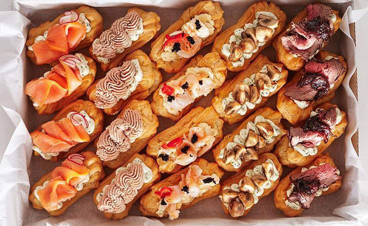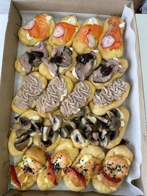 Сет "Эклеры" (840 г) Состав сета: эклеры с подкопченной форелью и сливочным сыром, эклеры с утиным паштетом, эклеры с яичным салатом и креветками, эклеры с шампиньонами и сливочным сыром, эклеры с ростбифом и луковым мармеладом