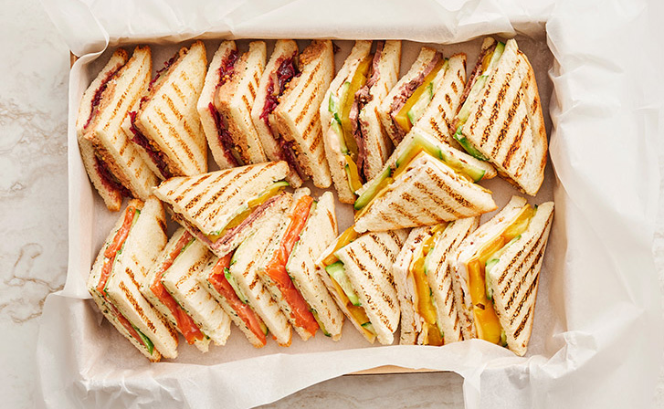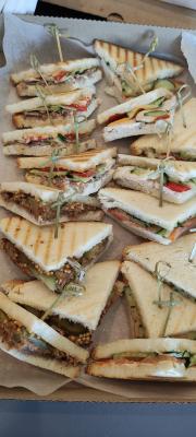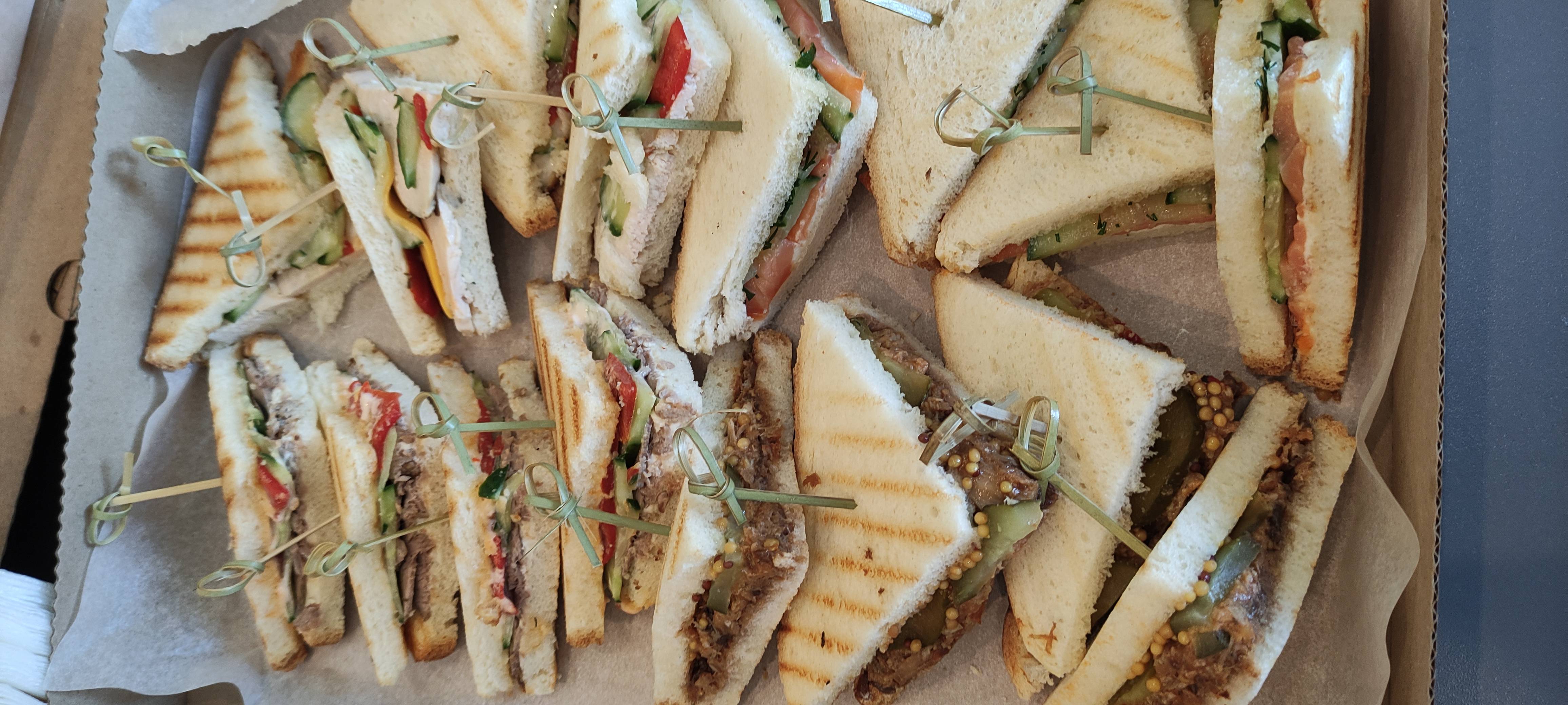 Сет "Сэндвичи" (780 г) Состав сета: сэндвичи с ростбифом, печеным перцем и соусом шрирача, сэндвичи с подкопченной форелью, базиликовым сливочным сыром и кунжутным маслом, сэндвичи с гриль-курицей, чеддером, свежим огурцом и чесночным соусом, сэндвичи с рваной свининой, луковым, мармеладом и соусом барбекю