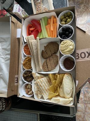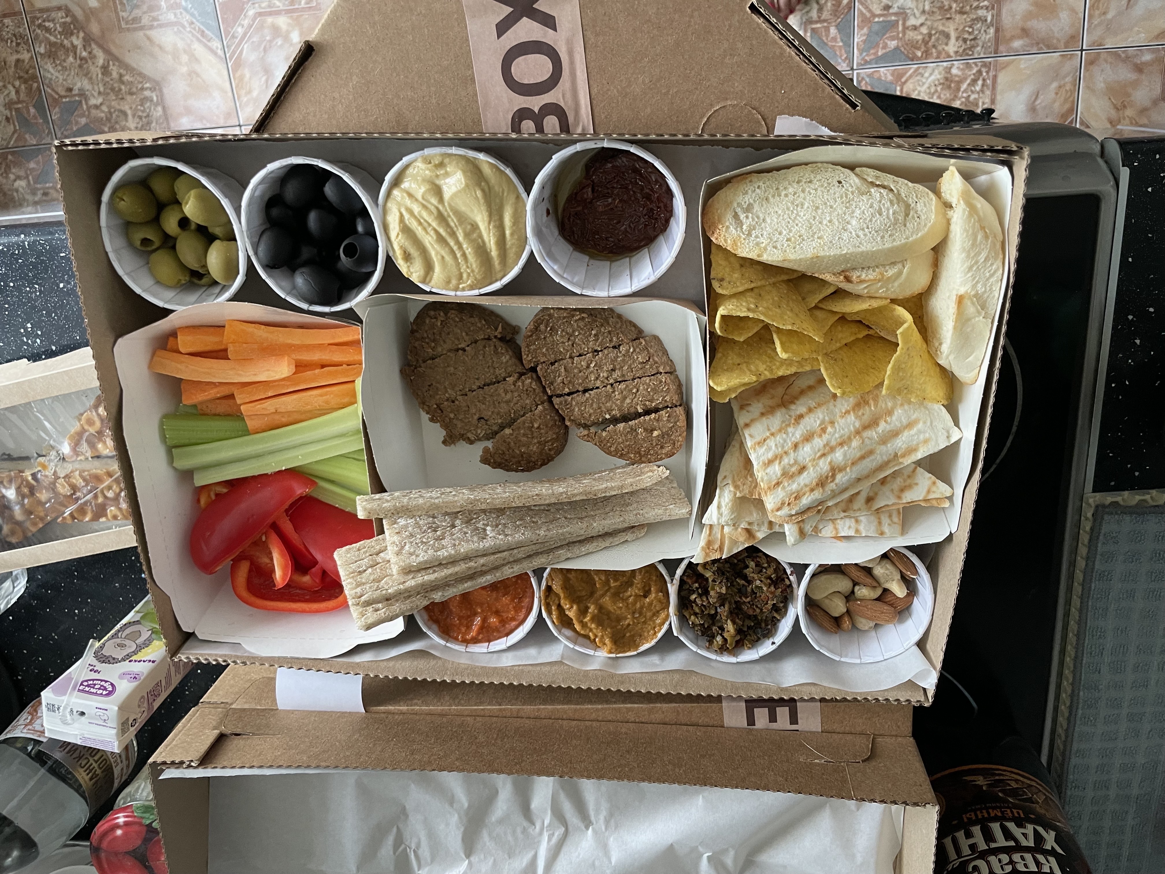 Сет "Немясо" (1110 г) Состав сета: намазки: баба гануш (намазка из баклажанов), хумус, тапенад из маслин, мухаммара (дип из печеного перца и грецких орехов), дип из шелкового тофу с песто, хлебная корзина: багет с томатами и маслинами, хлебцы, пита, начос, овощи: сельдерей, морковь, перец, закуски: веган стейк, оливки и маслины, вяленые томаты, микс орехов