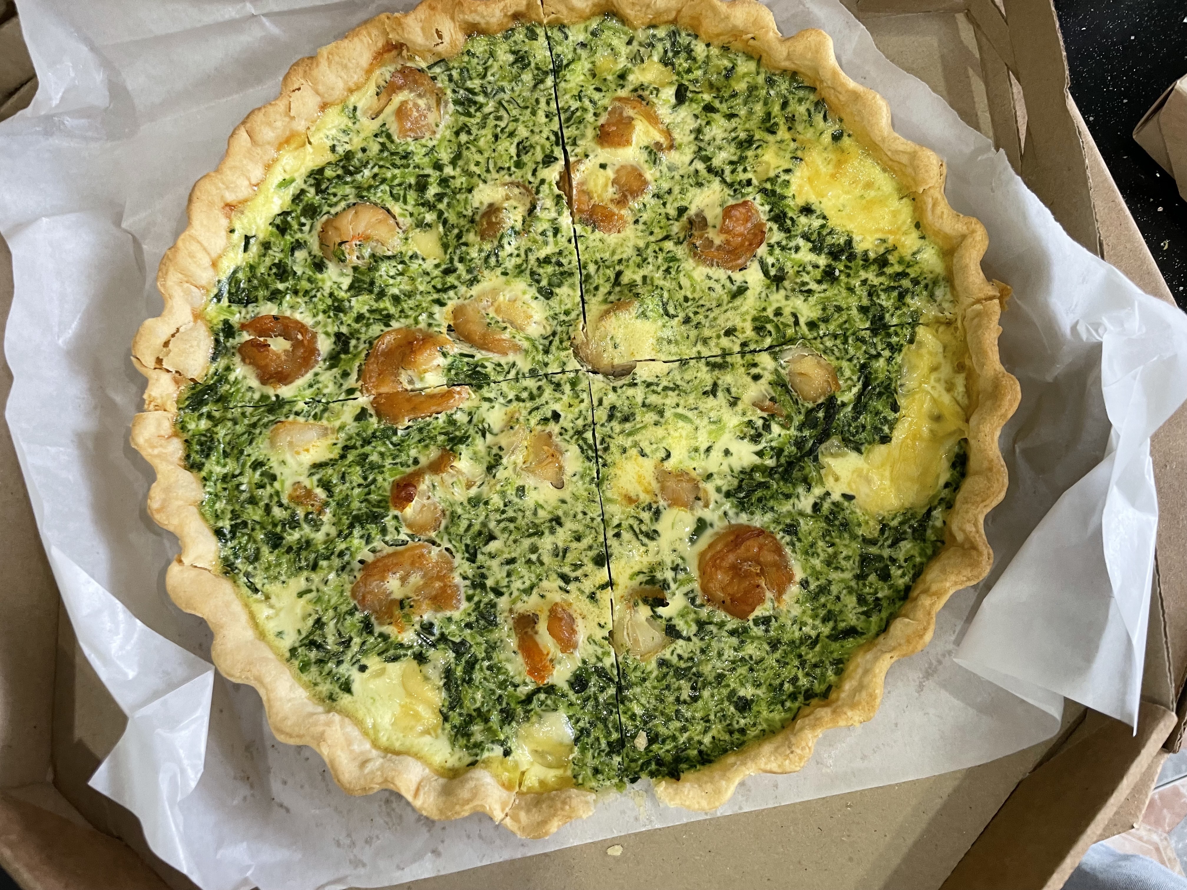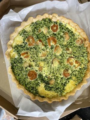 Киш с креветками и шпинатом (820 г) Состав: основа из песочного теста, яйцо, сливки, сыр твердый, креветки, шпинат, паста том ям