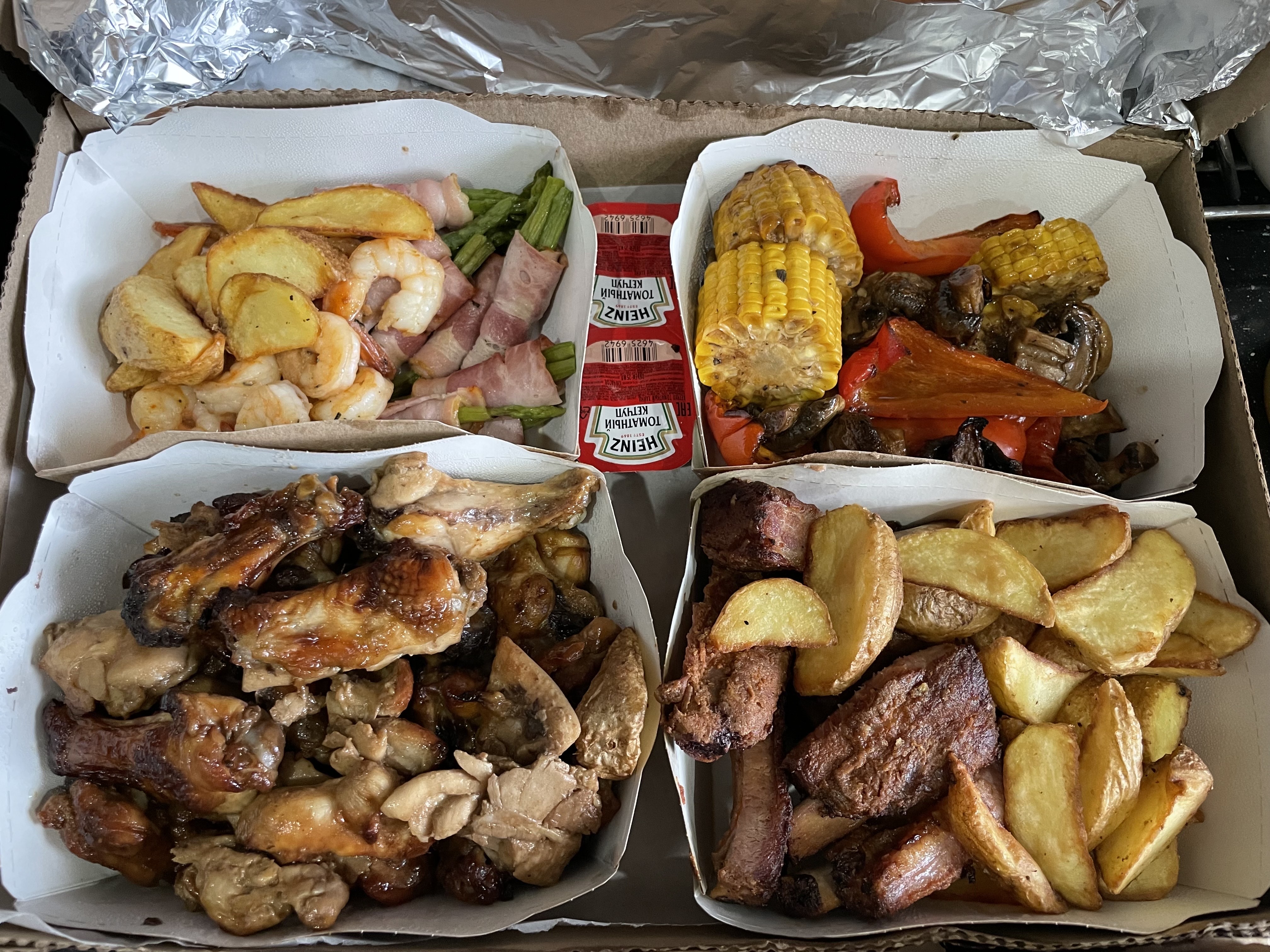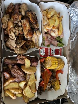 Сет "Крафт" (2000 г) Состав сета: свиные ребра в пряном маринаде, куриные крылья в горчичном маринаде, креветки в остром маринаде, курица в горчичном маринаде, спаржа в беконе, вощи гриль (перец, кукуруза), шампиньоны гриль, картофельные дольки, горчичный соус, кетчуп