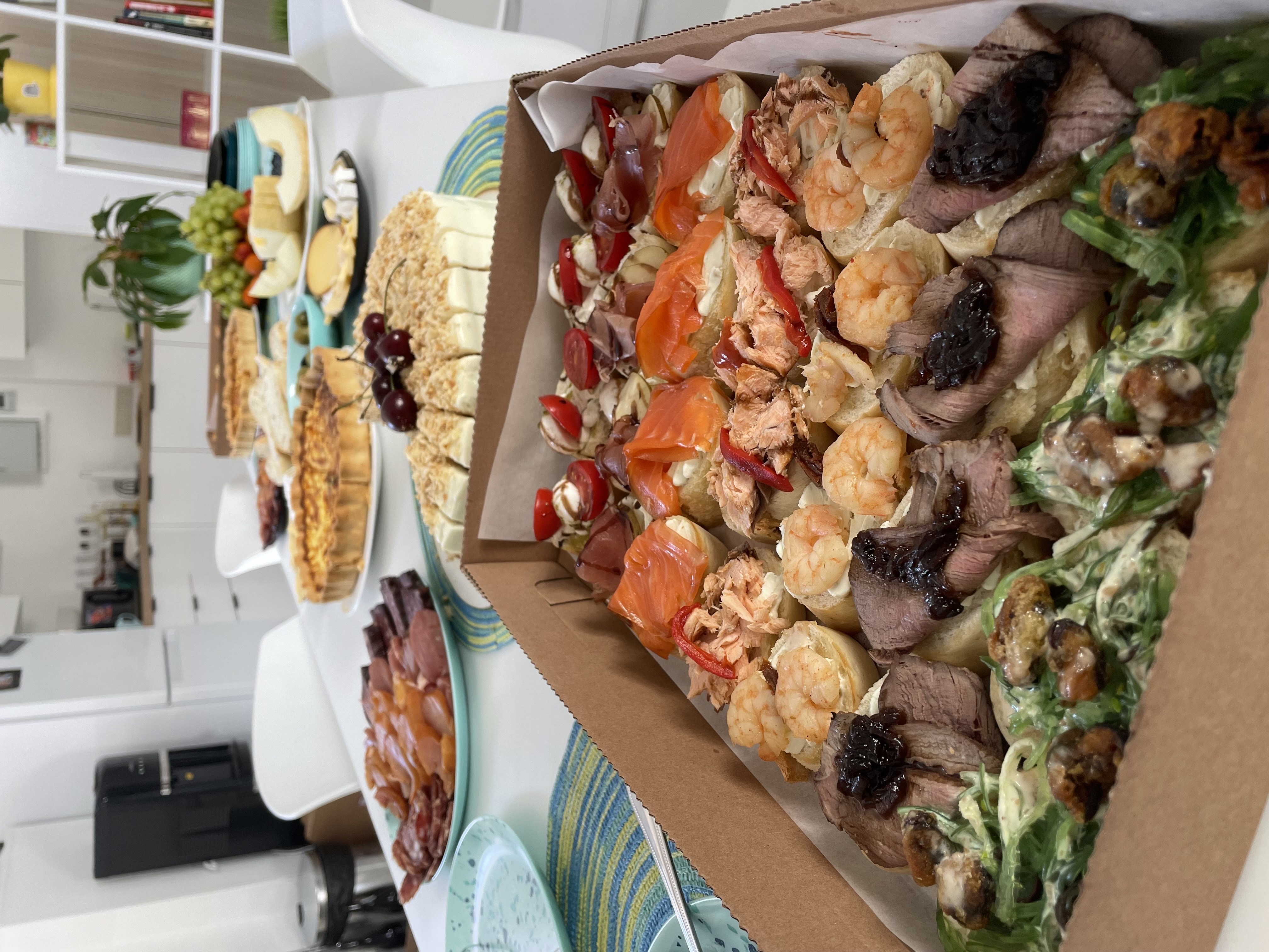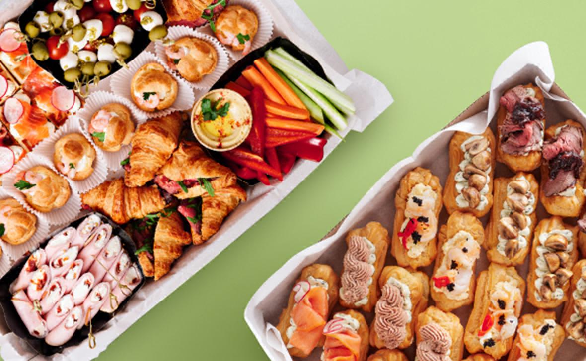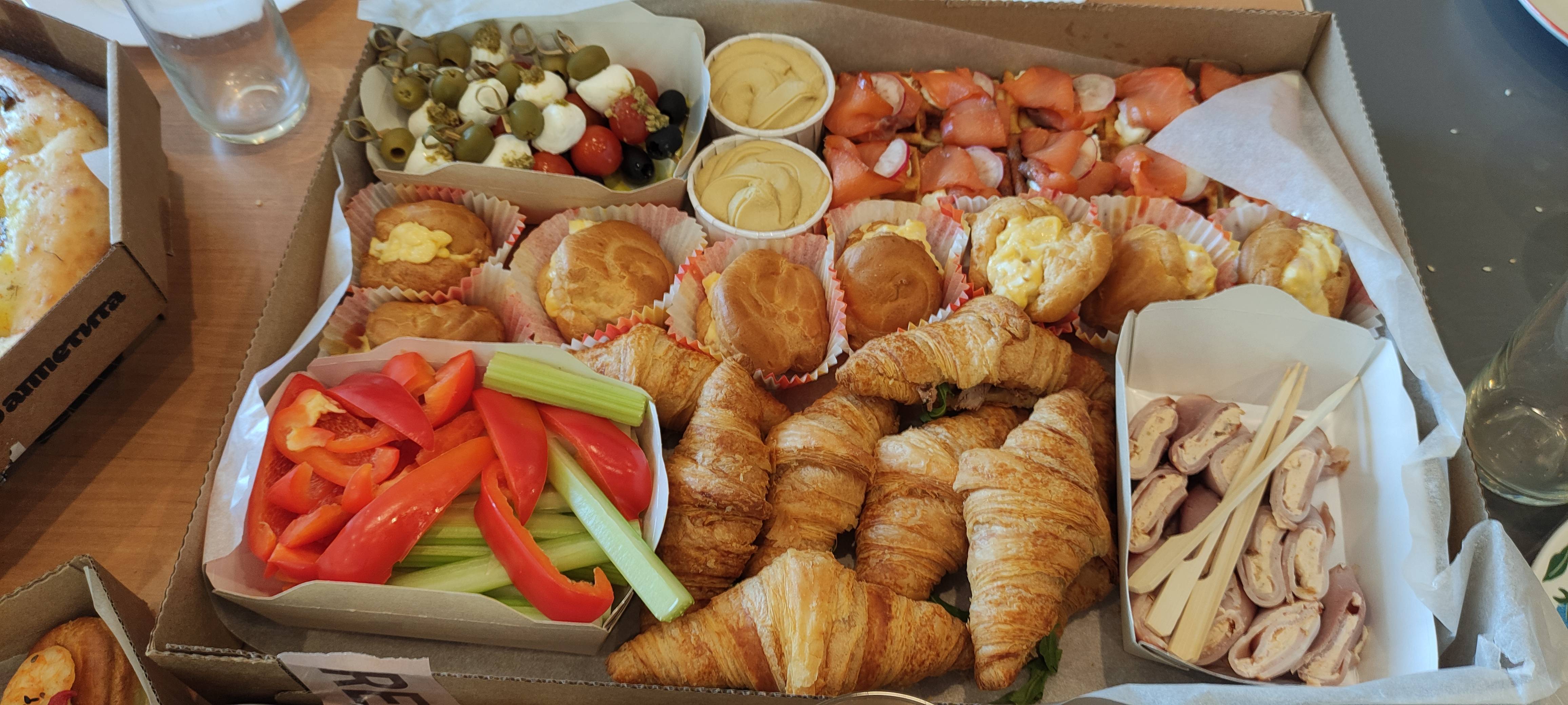 Сет "Классика" (2300 г) Состав сета: рулетики из ветчины с мягким сливочным сыром, зернистой горчицей и вялеными томатами (12 шт), закуска капрезе на шпажках (12 шт), картофельные вафли с форелью и сливочным сыром (10 шт), профитроли с креветками (8 шт), мини-круассаны с ростбифом (8 шт), сельдерей, морковь, перец, хумус