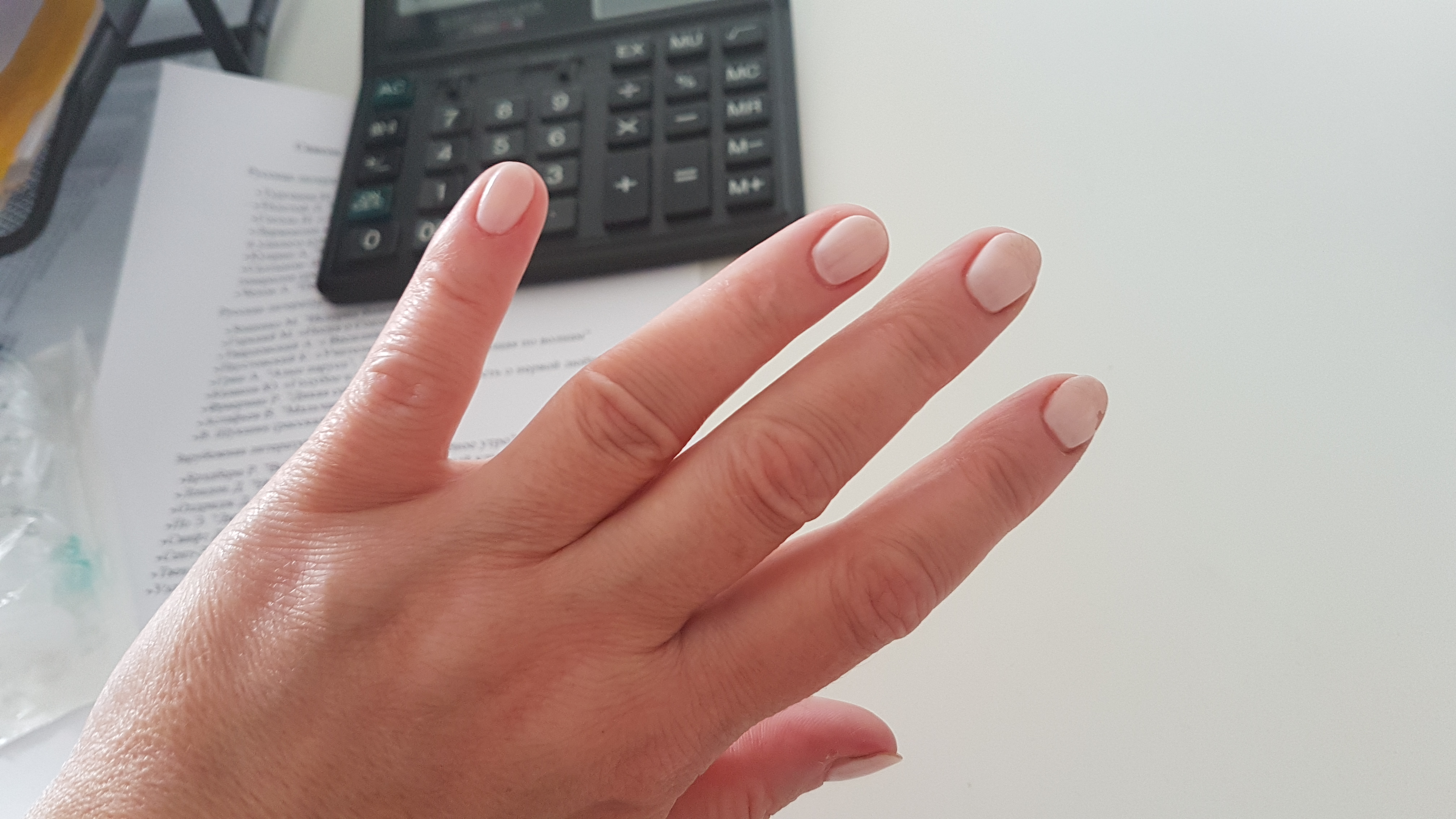 внешне похоже на обычный лак. Через 10 дней на правой руке на концах образовались