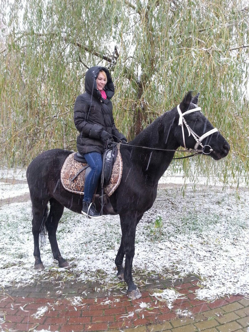 Прогулка была приятной и удивительной. Падал пушистый снег хлопьями и я была верхом на вороной лошади Капри. Мы катались по парку в Малиновке. Мне очень понравилось. Спасибо