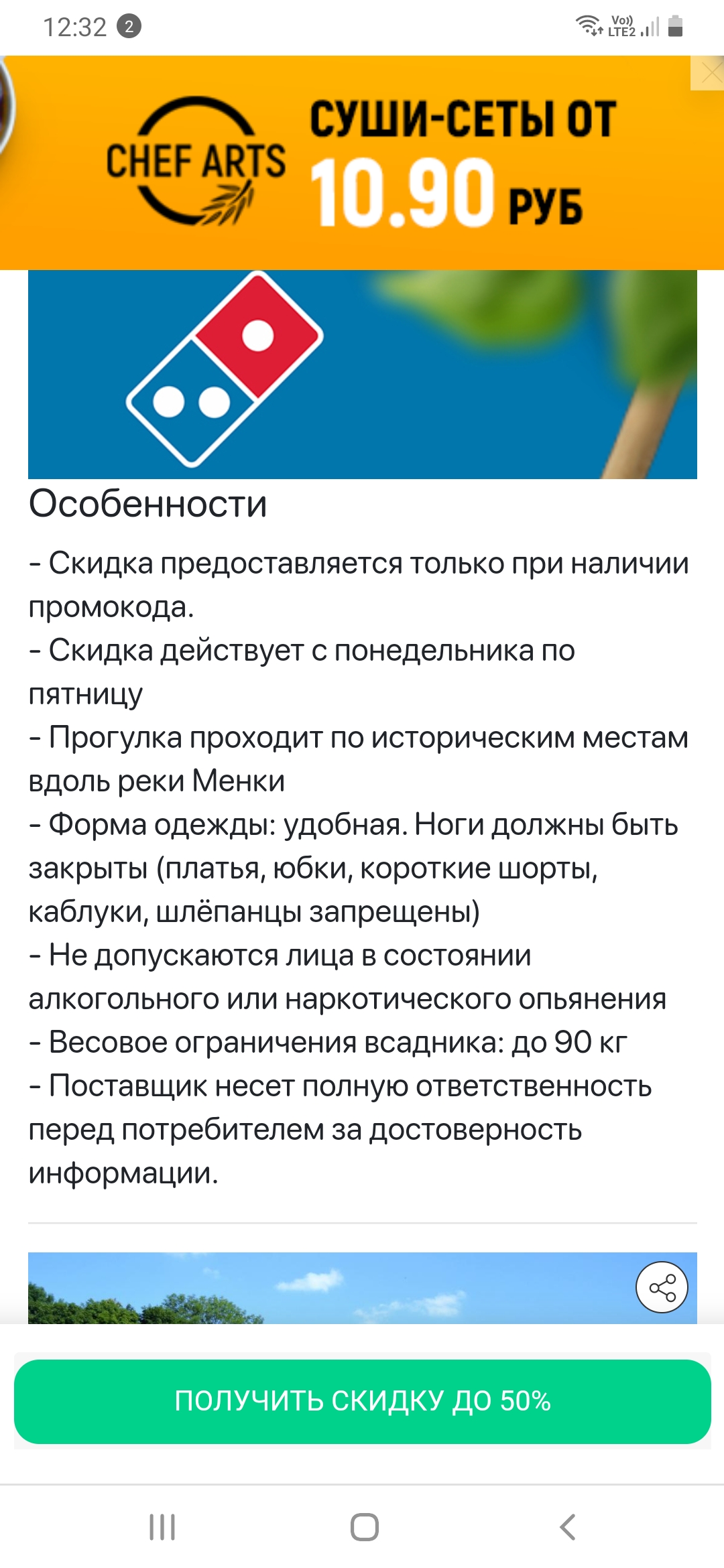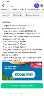 - Промокод дает право на скидку до 50% на конные прогулки с понедельника по пятницу