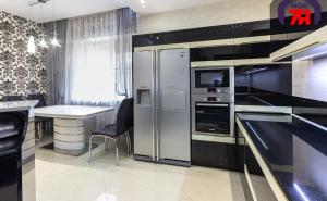 - Кухня 19,7 м² по индивидуальному проекту со встроенной бытовой техникой и каменными столешницами.