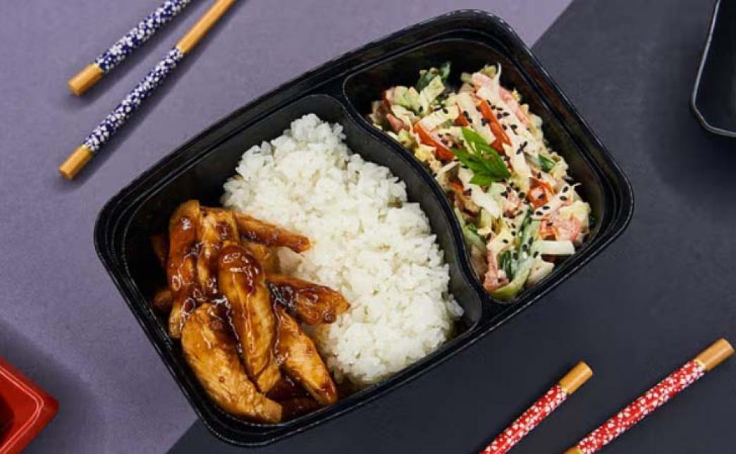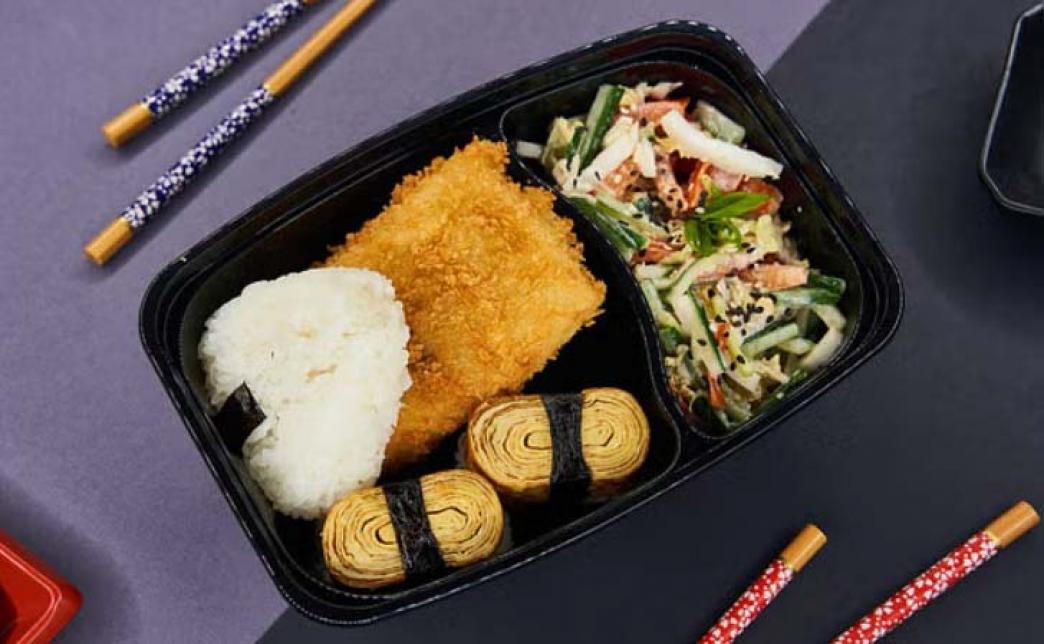 Состав: тофу жареный в кляре, онигири (1 шт), тамаго нигири (2 шт), салат овощной, соус терияки