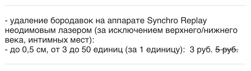 - Промокод дает право на скидку до 68% на лазерное удаление папиллом, бородавок (за исключением лица, верхнего/нижнего века, интимных мест)