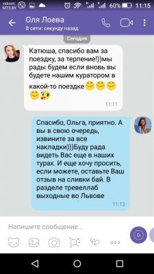 С 8.12. по 11.12 ездил в тур во Львов, с TravelLab!!! Очень много впечатлений, поездка была настолько насыщенной, что просто такое ощущение, что был там неделю. Очень большое количество кафе, за пару часов можно побывать в четырех кафе, когда в Минске за такую сумму ты только в одном едва ли посидишь. Большое спасибо нашей самой лучшей сопровождающей Веронике, она абсолютно всё знает, подскажет куда можно сходить развлечься, причем интересно и не дорого, где стоит побывать, интересные достопримечательности, где купить не дорогие подарки для близких. Объясняет в нормальной доходчивой форме, главное внимательно слушать, ну и по организации поездки благодаря Веронике все проходило очень четко и слаженно!
