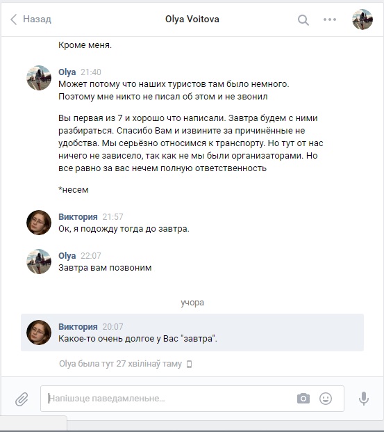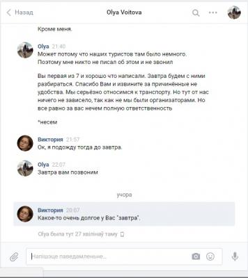 Хотелось бы и мне поделиться впечатлением от поездки во Львов 28.07-31.07. Город восхитителен, экскурсии увлекательны. Впечатление испортили водители и сопровождающая Алина. Как мы поняли для Алины это был первый опыт и, конечно, вначале сделали для нее поблажку... Но в общем и целом она просто не создана для этой работы. Не смогла грамотно и без проволочек организовать рассадку пассажиров (в результате чего из Минска мы выехали не в 18.30, как планировалось, а в начале восьмого, хотя уже в 18.00 все были возле автобуса). После расселения в гостиницу до выхода на экскурсию у нас было всего лишь 45 мин на бросить сумки и собраться. Приехали в центр Львова и еще 30 мин бегали кругами всей толпой, искали нашего экскурсовода, потому что Алина не знала города и была без электронного путеводителя, пришлось нам самим выводить себя на встречу с экскурсоводом. На второй день была экскурсия "По крышам и подземельям"... но в реальности это была экскурсия по подземельям, крыши туда не входили и близко)) Водители вообще выдали нам чудесную первую ночь, решив сократить дорогу и поехать по незнакомой местности. Результатом чего была езда 20км/ч, ухабы, кочки, синяки и не возможность поспать, а в конечном итоге наше опоздание с приездом во Львов, завтраком, укороченной экскурсии в беговом режиме и заселением в отель на час позже. Короче, впечатлений хватило)) Завидую группам, которым достался восхваляемый Максим. В следующий раз буду спрашивать поездку с ним))