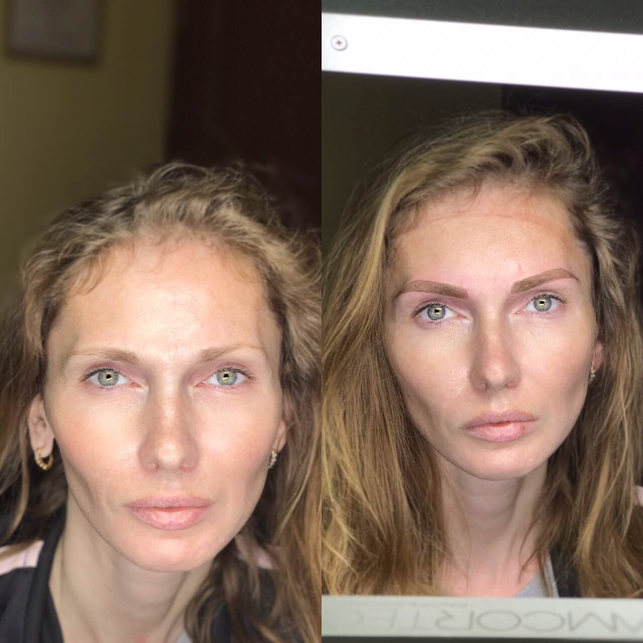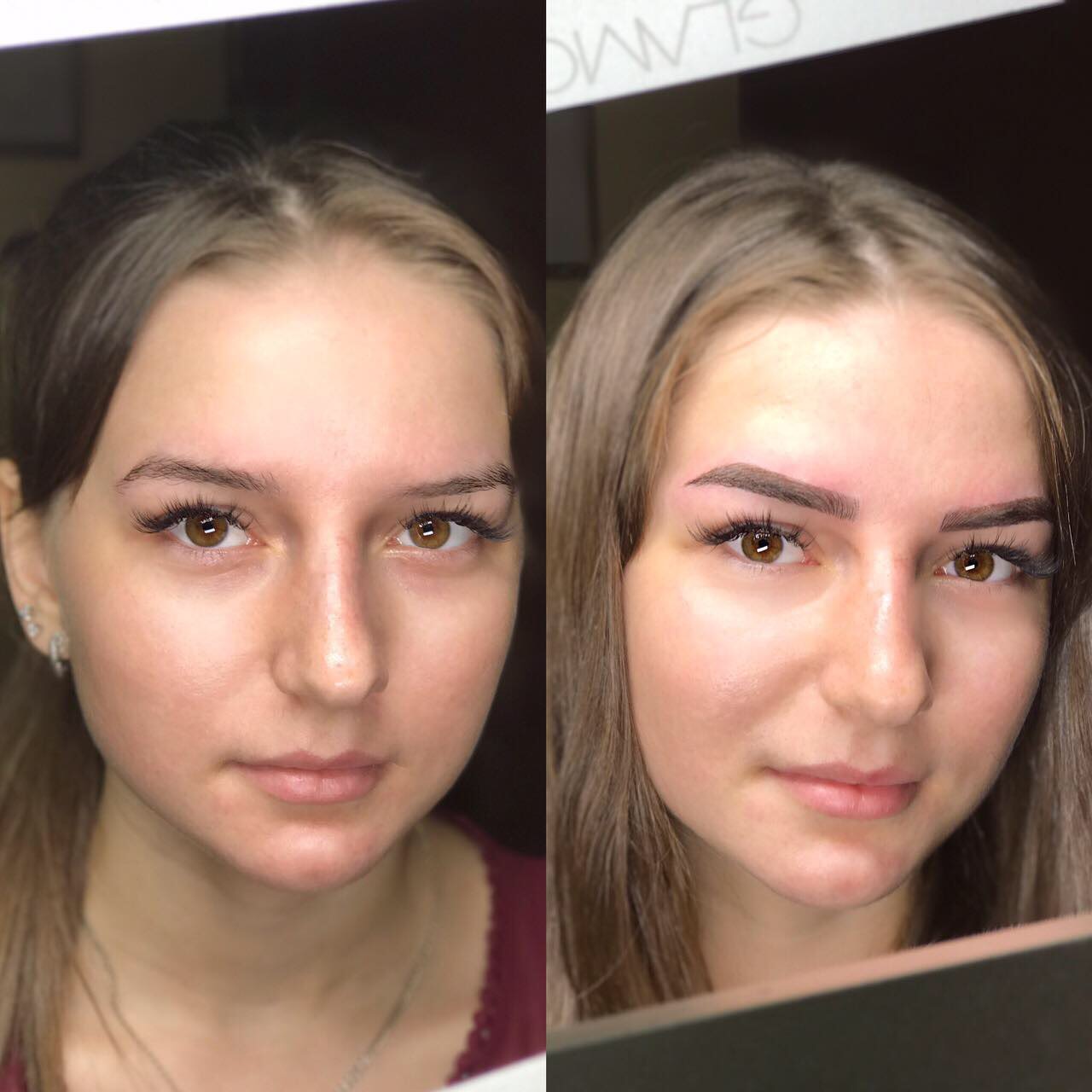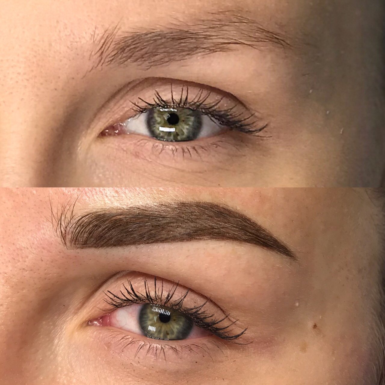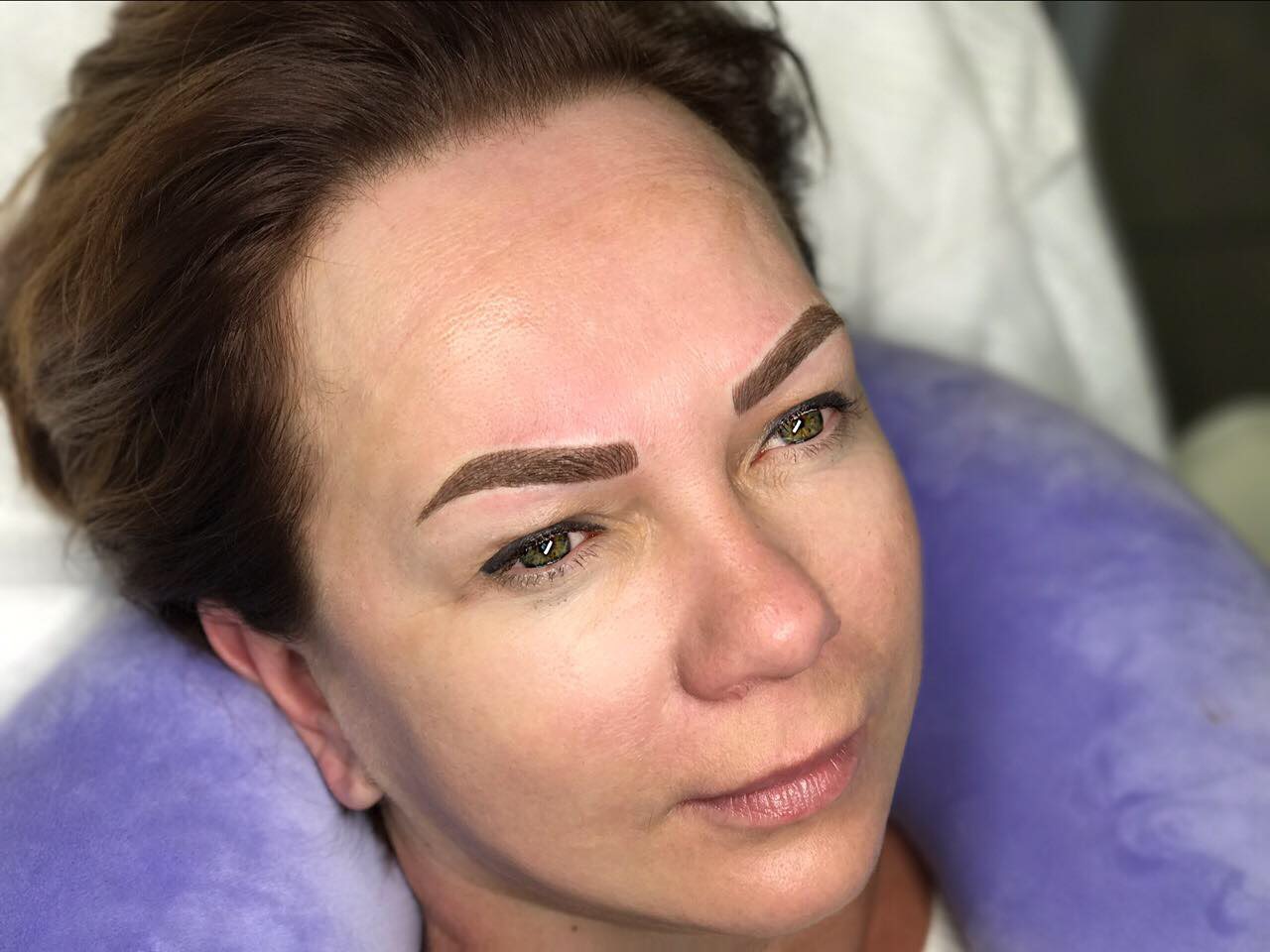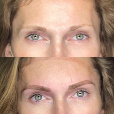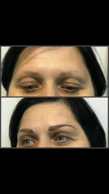 Брови (техника волоски) мастер прорабатывает каждый волосок и добивается «натурального» эффекта.