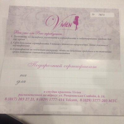 - Возможность приобретения подарочных сертификатов на любую услугу (комплекс услуг) или на сумму. Срок действия подарочного сертификата в течение 3-х месяцев со дня приобретения