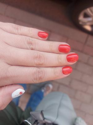 - снятие старого покрытия фрезой, придание формы ногтям, гигиеническая обработка кутикулы и боковых валиков аппаратным способом с использованием абразивных стерильных фрез, или комбинированным способом (фрезы + ножнички/кусачки), однотонное покрытие ногтей гель-лаком, масло для кутикулы