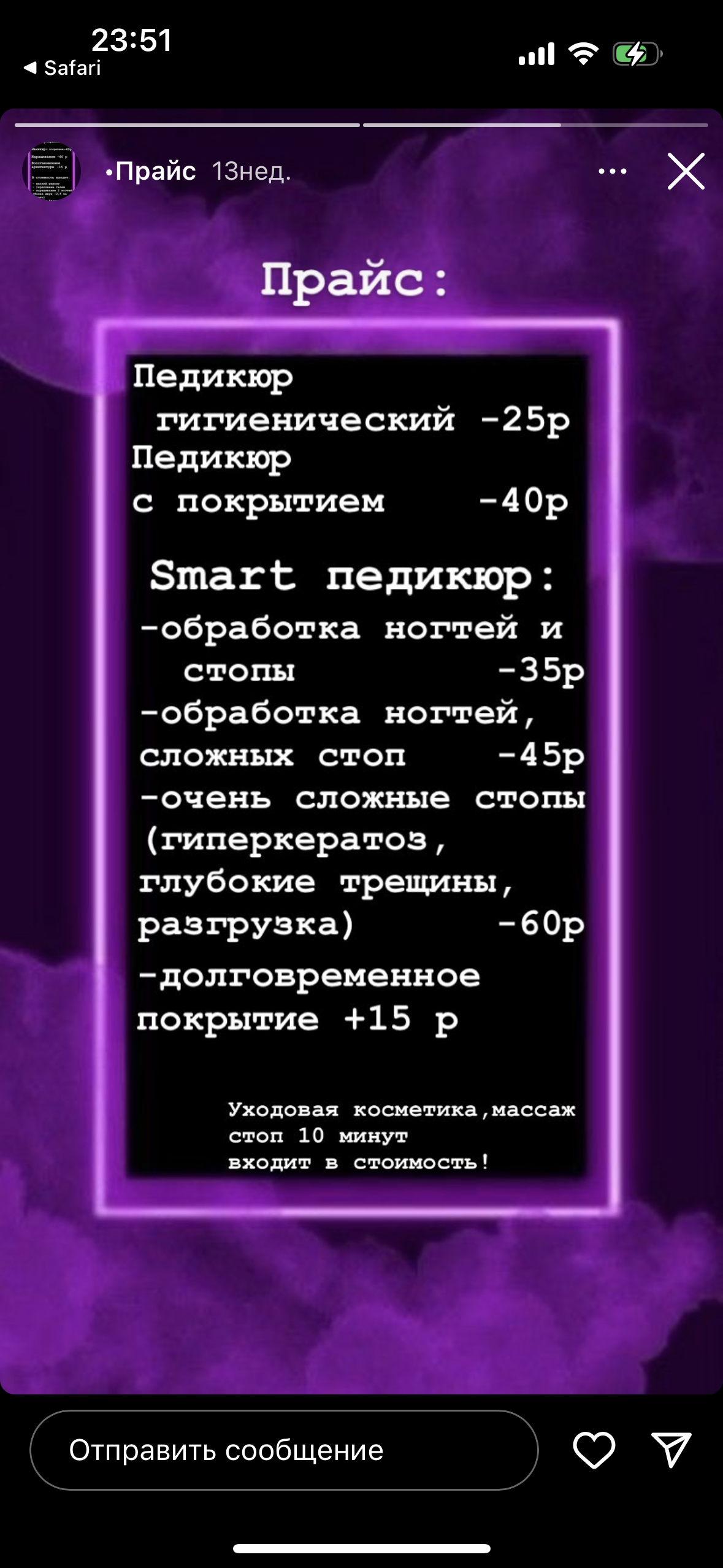 - педикюр без покрытия + обработка (не сложной) стопы: 35 р. 50 р.