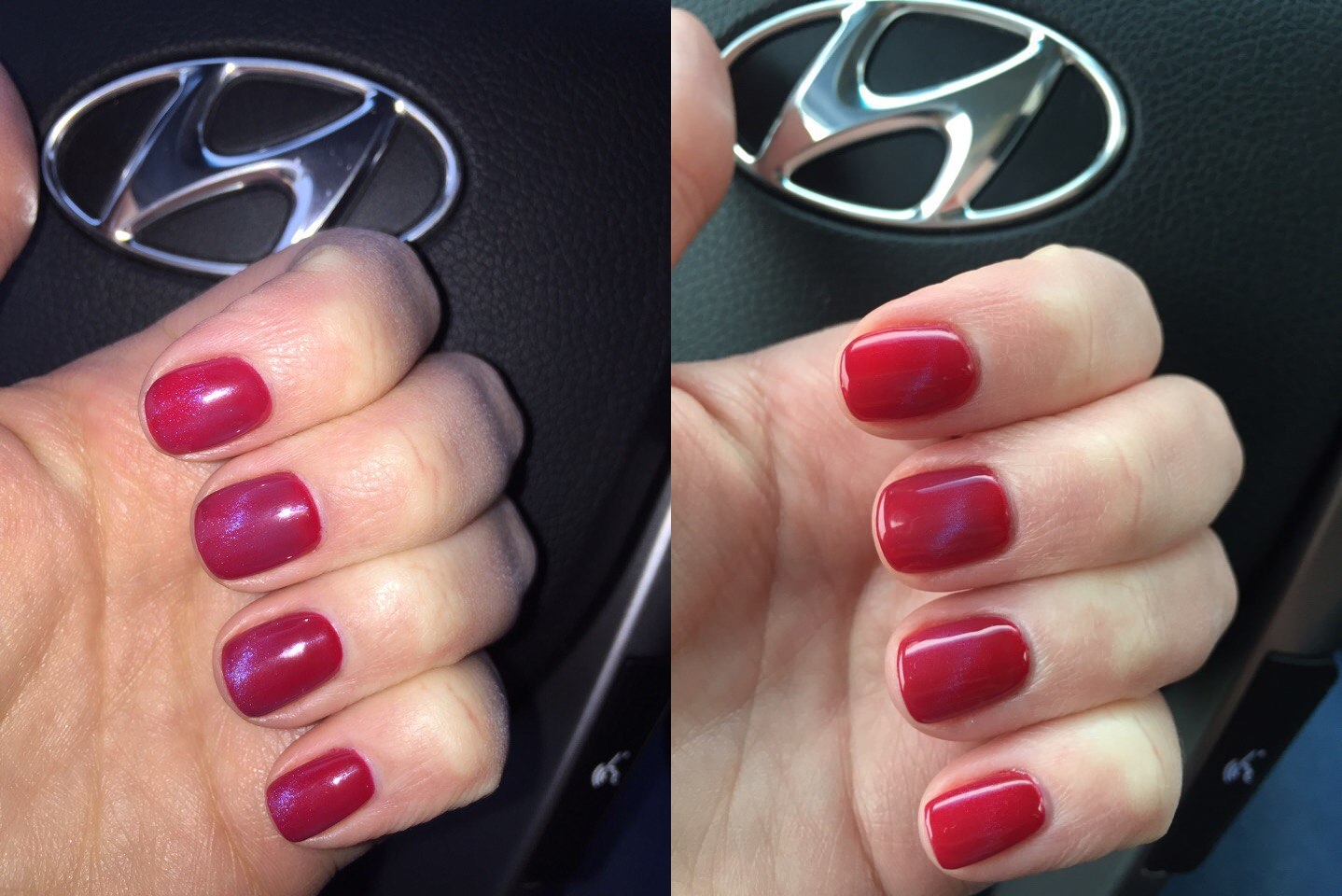 По результатам: прошло 2 недели - лак не поблек, образовался 1 маленький скол на большом пальце (но его удалось подкрасить подобранным по цвету обычным лаком, который - как ни странно! - взялся и не испортил основное покрытие).