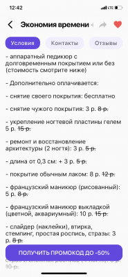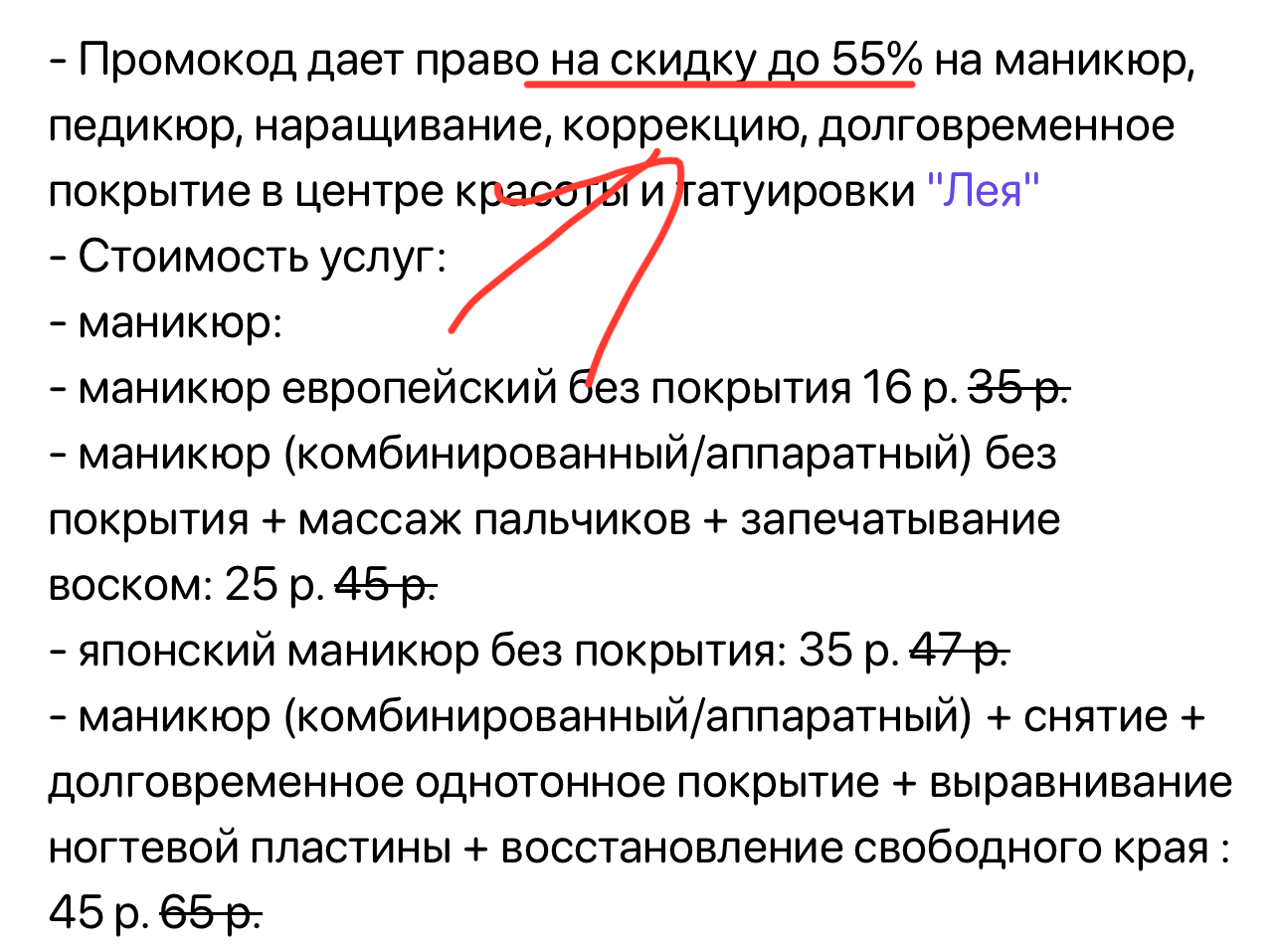 - Промокод дает право на скидку до 55% на маникюр, педикюр, наращивание, долговременное покрытие в центре красоты и татуировки "Лея"