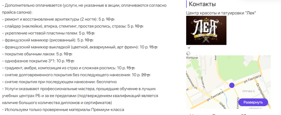 - Промокод дает право на скидку до 55% на маникюр, педикюр, наращивание, долговременное покрытие в центре красоты и татуировки "Лея"