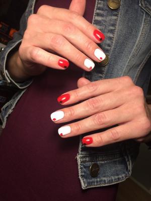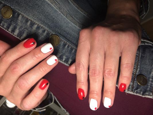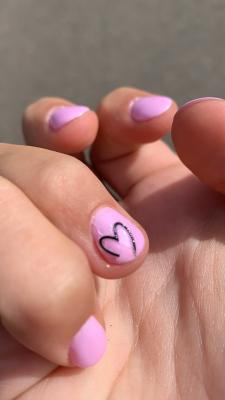 Дизайн (доплата 1 руб за каждый ноготь) сделан не аккуратно, на следующий день после маникюра сердечко обломалось. Очень жаль. Хотя мастер была мила, рассказала об аппаратном маникюре, все стерильное,  запаковано, что радует.