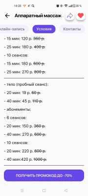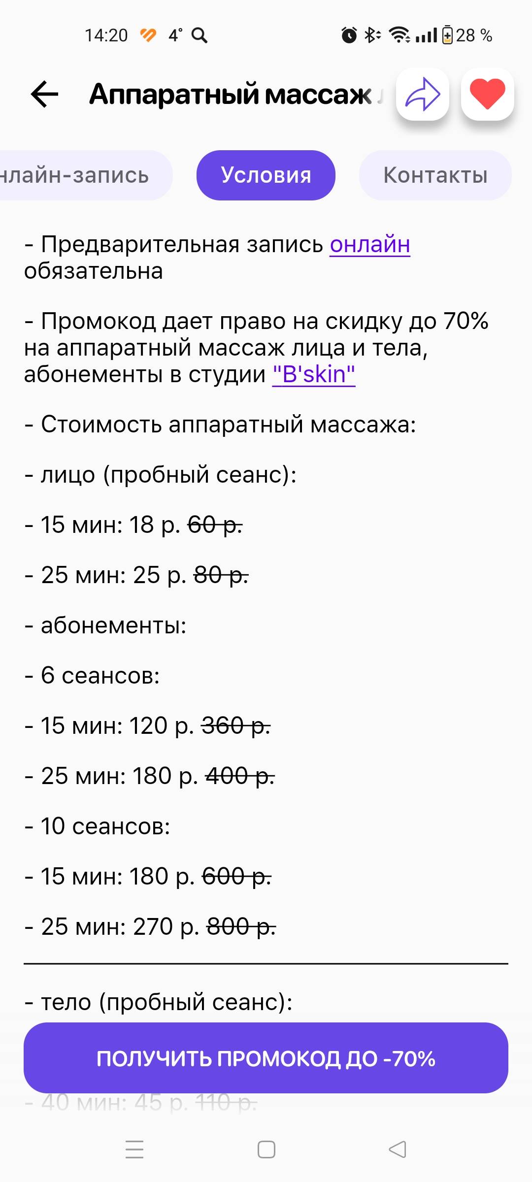 - Промокод дает право на скидку до 70% на аппаратный массаж лица и тела, абонементы в студии "B'skin"