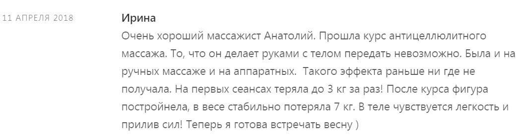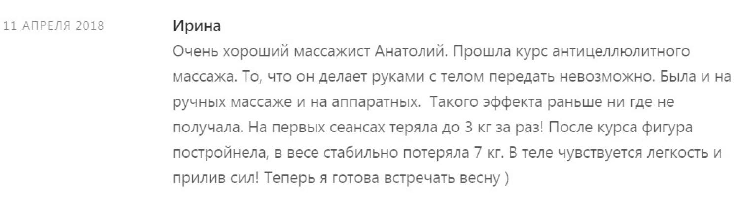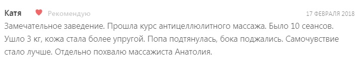 Антицеллюлитный массаж. Благодаря массажу уплотняются стенки кровеносных сосудов, происходит стимуляция оттока крови и лимфы. Применяя массаж, вы сможете улучшить контуры фигуры, похудеть, существенно улучшить состояние кожи.
