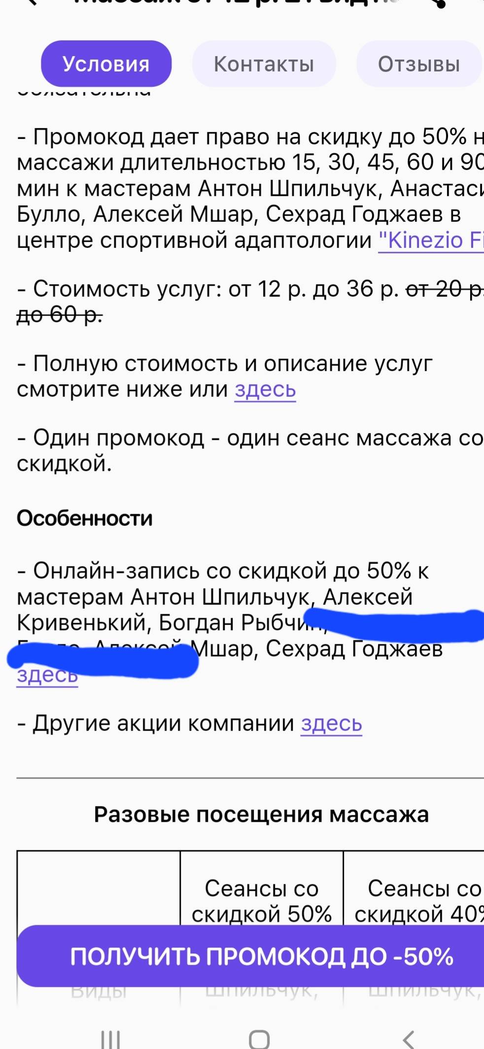 - Один промокод - один сеанс массажа со скидкой.