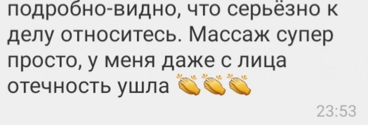 Делала курс массажа (антицеллитный и спины), все супер!!!  Массаж качественный очень!!! Спина вообще не болит, во всем теле легкость, ушла отечность, а кожа стала ровнее. Очень рекомендую! Буду продолжать)