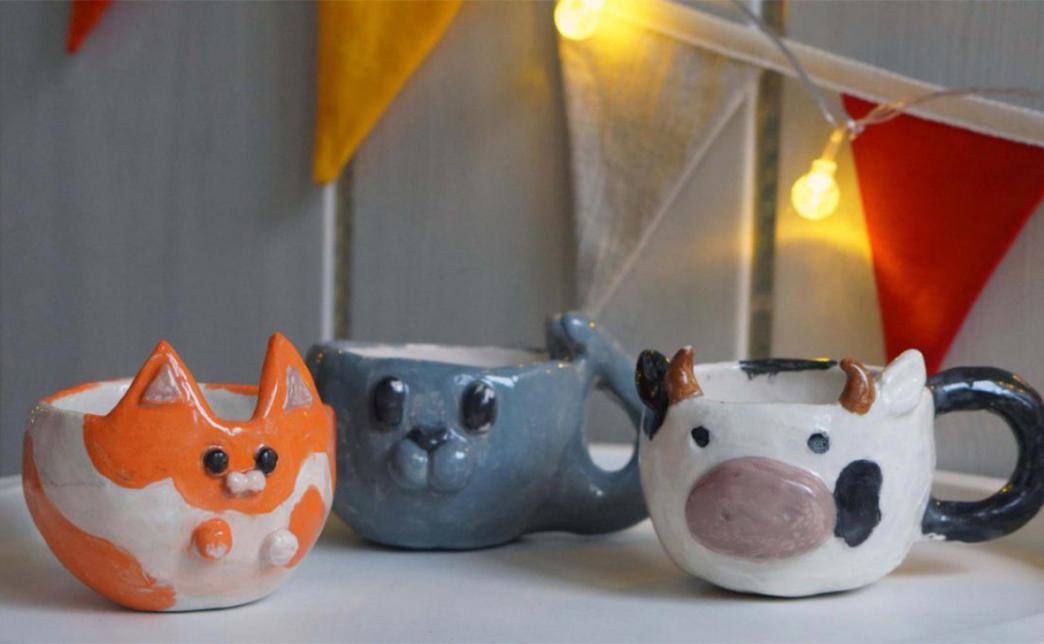 - Тема лепки (на выбор): кружка со зверушкой, кружка с оттисками растений, надписями, украшениями, фигурками и другим сложным декором. Лепим из белой глины и раскрашиваем цветными ангобами.