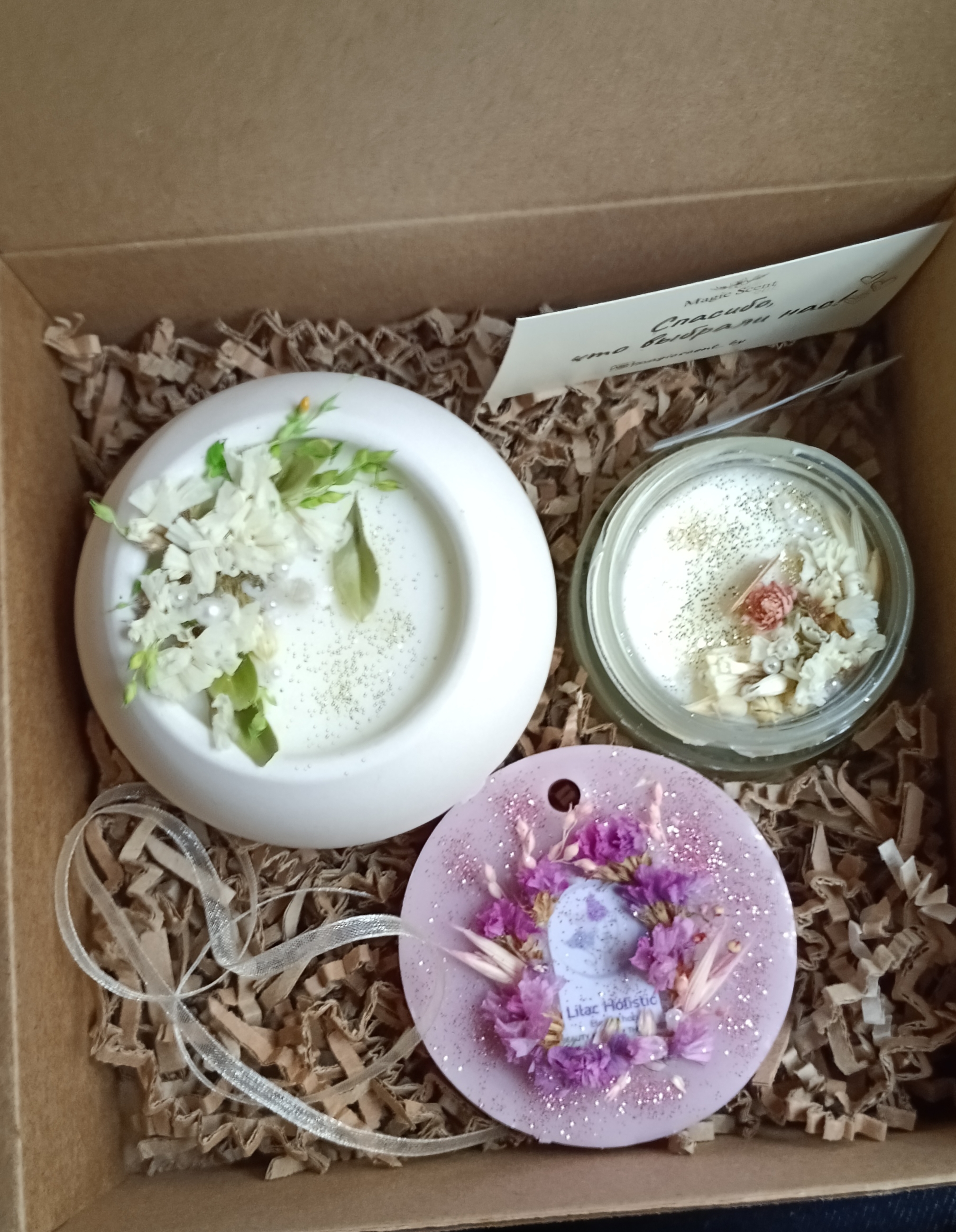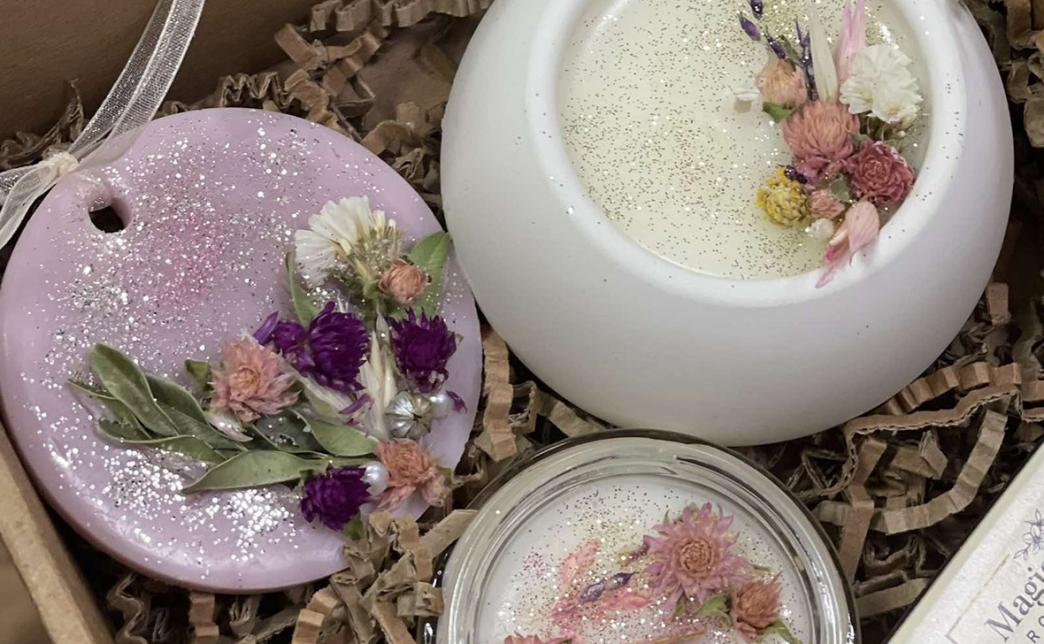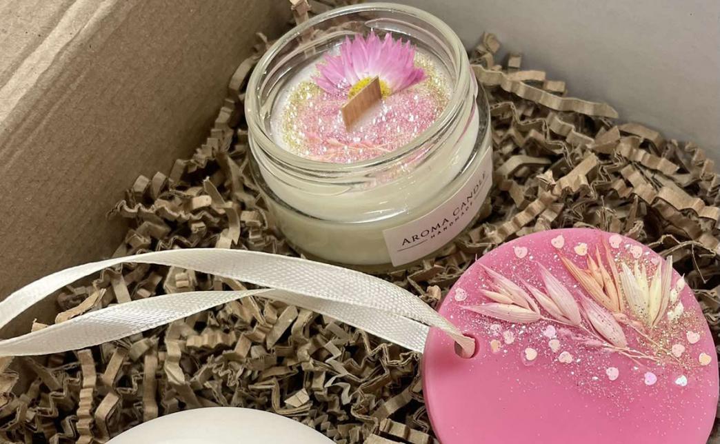 Все изделия мы выполняем из 100% натурального соевого воска, добавляем премиальные ароматы и декорируем изделия различными сухоцветами, блестками, бусинками.