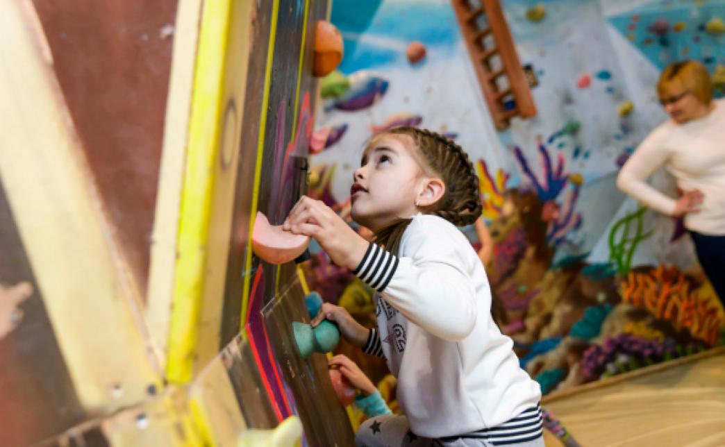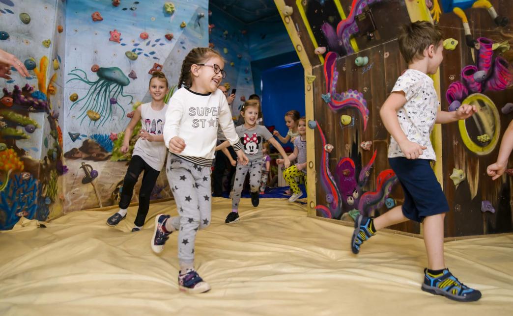 Современный скалодром, спроектированный специально для детей от 2 лет, оформленный в подводной тематике с ультрафиолетовой подсветкой. Высота стен - 3 м, скалодром оснащен мягким напольным покрытием.