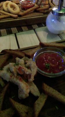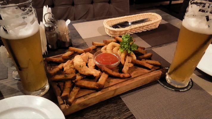 «Пивная закуска для двоих» 650/50/50/10 г Куриные наггетсы, гренки из белого хлеба, сырные палочки, луковые кольца, подаётся с соусами – барбекю и тартар |